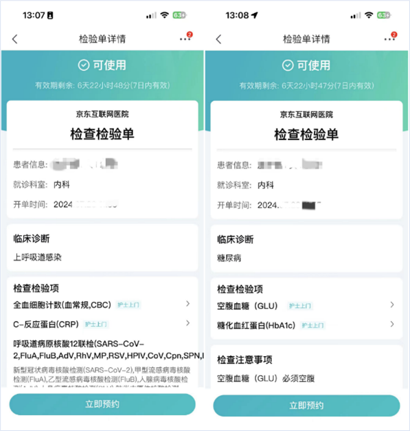 此次,京东健康互联网医院“线上开具检验单服务”首批包含70项采血项目,涉及上呼吸道感染、糖尿病评估、甲状腺功能异常、高尿酸血症/痛风、高脂血症等病种,服务范围覆盖北京五环内及部分六环区域。暑期刚至,一位8岁儿童突发急热,家长到京东健康互联网医院发起问诊。医生了解孩子的症状后,在线上为其开具了血常规+C-蛋白检验单以及呼吸道病毒细菌12联检。根据检验报告,医生认为暂时无需抗病毒或抗生素治疗,并给出了具体用药建议。此外,检验单显示该名患者红细胞两项略低,提示患儿可能铁储备不足,因此还给出了日常饮食的调整建议。京东健康互联网医院“线上开具检验单服务”上线之后,与此前京东另一项服务京东到家快检推出的上门快检服务形成了在线医疗服务闭环。据了解,去年冬季呼吸道疾病高发,京东到家快检第一时间推出了面向用户的“呼吸道病毒细菌12联检测”服务。这种检测模式链接了上游试剂厂商、下游医学检验实验室,并由京东健康提供专业的配送运力和采样服务。这一次,京东健康互联网医院将专业医疗检测延伸至线上问诊流程之中。通过这一服务模式,患者可以根据医生建议,结合自身情况,轻松完成进一步的专业医疗检测。由专业护士依据预约信息上门为患者进行采血或收集其他样本,医生再根据检测结果,给出更为精准的诊断和治疗建议。一个现实是,京东、美团官宣下场线上检验,虽然路径不同,一个致力打造“医检药”服务闭环、一个主攻居家快检,但相同点是:它们都将成为传统临床检验逻辑的颠覆者!显然,互联网巨头提供的是线上渠道,服务中涉及的就业需求和检测需求其实还是由医疗机构和第三方医学实验室提供。以外卖平台为例,医疗机构和第三方医学实验室实际扮演了外卖商家的角色,专业护士或者经过培训的配送员则扮演外卖员的角色。