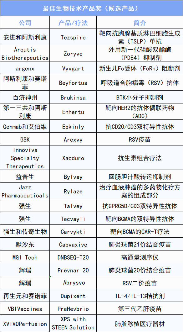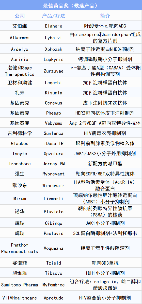 2024盖伦奖的候选名单包括最佳生物技术产品奖(Best Biotechnology Product),最佳药品奖(Best Pharmaceutical Product),以及最佳罕见病产品奖(Best Product for Rare/Orphan Diseases)三个类别。它们均为最近5年内获得美国FDA批准上市,并且有潜力对人类健康产生重大影响的产品。评委将根据产品的科学和健康影响进行评估,而不考虑产品的销售数据。