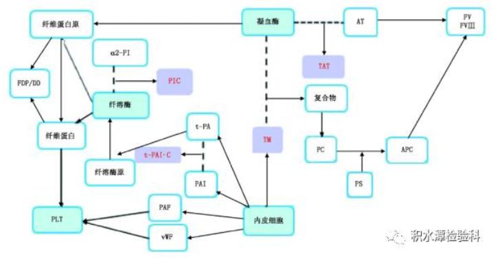 人体内出凝血系统是一个非常庞大且繁杂的系统,机体通过凝血、纤溶、血小板、内皮四个系统的参与时刻维持着动态平衡。促凝与抗凝活性的失衡将直接导致血栓性疾病与出血性疾病的发生,且血栓性疾病更常见。目前实验室凝血常规检测项目,如PT、APTT、TT、Fbg、D-二聚体、FDP、抗凝血酶、凝血因子等已涵盖凝血、纤溶等系统,但都属于在血栓形成后的被动检测、晚期筛查项目,对血栓前状态、Pre-DIC等疾病不敏感,同时对于溶栓治疗监测不能在第一时间反馈效果。 血栓分子标志物(TAT、PIC、TM、tPAI-C)与D-二聚体、FDP联合检测,可在早期更加敏感、可靠的向临床反馈血栓的发生与形成、术后血栓与出血情况的监控、Pre-DIC的状态、溶栓治疗的效果、血管内皮系统损伤等情况。 注:TAT:凝血酶抗凝血酶复合物;PIC:纤溶酶-抗纤溶酶复合物;TM:血栓调节蛋白;t-PAIC:组织型纤溶酶原激活物-纤溶酶原激活抑制复合物;AT:抗凝血酶;PC:蛋白C;PS:蛋白S;APC:活化的蛋白C;FV/FⅧ:凝血因子V/Ⅷ;α2-PI:a2-纤溶酶激活抑制物;t-PA:组织型纤溶酶原激活物;PAI:纤溶酶激活抑制物;FDP/DD:纤维蛋白(原) 降解产物/D-二聚体;PAF:血小板活化因子;vWF:Vonwilebrand因子 图1:凝血标志物活化示意图 凝血酶-抗凝血酶复合物(TAT) 凝血酶生成是静脉血栓形成的关键环节,它作用于纤维蛋白原使其转变为纤维蛋白而形成血栓。但凝血酶在血液中半衰期不到1分钟,会很快被抗凝物质中和,因此直接检测凝血酶非常困难。而作为凝血酶与抗凝血酶1:1结合形成的复合物,TAT可作为凝血酶生成的分子标志物,直接证实凝血系统的活化。 正常参考区间:0-4.0ng/mL TAT升高见于: 1) DIC,DIC前期状态 2) 深静脉血栓(DVT),肺栓塞(PE) 3) 某些心房颤动,与二尖瓣狭窄相关的心房颤动 4) 其他凝血系统激活状态 组织型纤溶酶原激活剂 及其抑制剂复合物(tPAI-C) 当凝血活化,纤维蛋白形成后可以激活组织型纤溶酶原激活剂(t-PA),活化的t-PA进一步激活纤溶酶原转化为纤溶酶,后者降解纤维蛋白形成D-二聚体。组织型纤溶酶原激活剂抑制剂PAI-1是t-PA的生理性抑制剂,二者1:1形成复合物即tPAI-C后,t-PA激活纤溶酶原的活性被抑制,进而抑制纤维蛋白降解。tPAI-C水平与t-PA浓度及血管内皮损伤程度呈正相关,是评估两者的直接标志物。 正常参考区间:男性:0-17ng/mL 女性:0-10.5ng/mL tPAI-C升高见于: 1) DIC 2) 血管内皮损伤 3) 各种动脉和静脉血栓形成(DVT、急性心肌梗死等) 纤溶酶-α2抗纤溶酶复合物(PIC) 纤溶酶是纤溶系统的重要组成部分,活化的纤溶酶半衰期极短,仅仅几秒钟,体内不易测定,纤溶酶生成后迅速与α2纤溶酶抑制剂1:1结合形成复合物,纤溶酶-α2抗纤溶酶复合物(PIC)的出现直接反应纤溶酶的生成,可用于纤溶类疾病的辅助诊断及疗效观察。 正常参考区间:0-0.8ug/mL PIC升高见于: 1) DIC, DIC前期状态 2) DVT,PE 3) 在溶栓治疗的给药过程中(t-PA,尿激酶) 4) 其他纤溶激活状态 血栓调节蛋白(TM) 血栓调节蛋白(TM)是1981年首次由Esmon等确认并提出的一种存在于细胞膜表面的跨膜糖蛋白,TM大多出现在动脉、静脉、毛细血管和淋巴管的内皮细胞表面,可以辅助凝血酶激活蛋白C系统产生抗凝效果。当内皮细胞发生病变或受损时,常引起TM的表达、分泌异常、释放入血,从而引起TM含量变化,因此可作为内皮细胞损伤的标志物。 正常参考区间:3.8-13.3TU/mL TM升高见于: 1) 自身免疫性疾病:SLE等 2) DIC 3) 急性呼吸窘迫综合征(ARDS) 4) 血管内皮损伤 TAT对于DIC、DVT等引起高度凝血激活的病理状态,是敏感标志物,已列入2014年日本血栓止血学会暂定的DIC诊断标准。但对于进行华法林等抗凝治疗的患者,无法发现低凝水平的血栓形成,因此不宜作为血栓监测指标,而是作为抗凝效果的指标。tPAI-C和PIC代表纤溶系统活化,具有很好的血栓诊断意义,原因可能在于其存在反映了纤维蛋白的生成(血栓形成),因此可以成为静脉血栓形成良好的监测指标。而纤溶的下游产物FDP和D-二聚体易受到底物量、血栓部位、血循环、代谢等因素影响,特异性较低。 以TAT为例,本检测采用化学发光免疫分析两步法定量检测凝血酶-抗凝血酶Ⅲ复合物(TAT)。生物素化凝血酶单克隆抗体(小鼠)与被检样本中的TAT发生特异性反应,再与链霉亲和素磁微粒结合。去除未反应物质后,加入碱性磷酸酶(ALP)标记的抗凝血酶Ⅲ单克隆抗体(小鼠)与磁微粒上的TAT 发生特异性反应。再次去除未反应物质后, 添加发光底物经磁微粒上的ALP 分解并发光,测定其发光强度。发光强度随被检样本中TAT浓度的增加而增加。如图2。 图2.TAT检测原理 参考文献 1.阮长耿.出血与血栓性疾病的诊断和治疗进展.临床血液学杂志,2010,23(1):1-4. 2.Su EP, Chatzoudis N, Sioros V, et al. Markers of thrombin generation during resurfacing and noncemented total hip arthroplasty: a pilot study[J]. Clin Orthop Relat Res, 2011,469(2):535-540. DOI:10.1007/s11999-010-1659-z. 3.孟英,刘建龙,吴俊,等.应用凝血标志物诊断创伤骨科术后静脉血栓形成的病例对照研究[J].中华检验医学杂志,2016,39(10):751-755. |