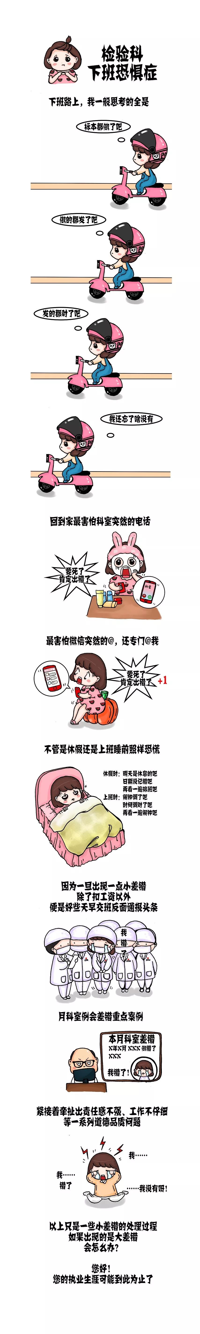 常听说上班恐惧症,而检验科的医务人员不仅上班恐慌,下班依然恐惧。 在检验科,因为科室为了杜绝差错而选择的重罚,使我们时刻都提心吊胆,如履薄冰。 检验医学网 我们每个人每天都是成百上千的标本量,在工作中不仅要求速度更要求质量,既要及时发布报告,又要准确无误。因为报告有误是差错,报告延时同样也是差错。纵使我们一刻不停歇,我们也没有三头六臂去应付偶尔出现的异常繁忙。 检验医学网 在结束一天的工作,拖着疲惫不堪的身体下班时,我常常害怕(标本漏做,做的没发,发的没对等等),即使再三核对,我们依然没自信打包票说今天平安无事。不管核对过多少次,依然担心核对的时候一个不小心,可能就漏标本了,一个眼花就看错报告了,一个手抖就填错数据了。纵使报告没有问题了,我还担心第二天上班迟到呢! 检验医学网 感觉每天都活在差错妄想症中。 |