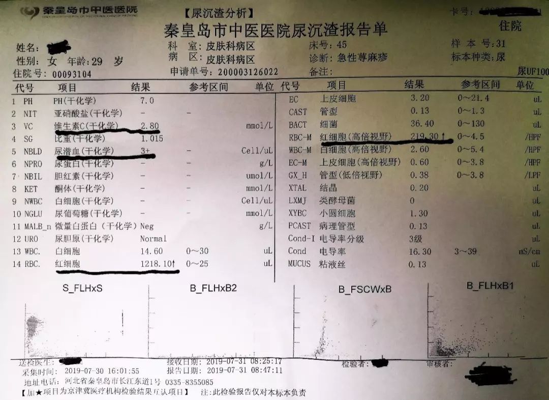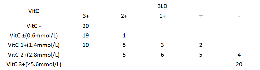尿潜血是尿液常规检测中的一项非常重要的指标,在临床上对肾病、泌尿系感染、尿路结石等很多疾病的诊断具有非常重要的意义。 尿液干化学分析仪为目前临床实验室中应用非常广泛的一种检测尿潜血的方法,但与传统显微镜红细胞计数检验相比,尿液干化学分析仪检测尿潜血虽然具有操作过程简单,快速,自动化程度高等优点,但干化学法在检测原理上有一定的局限性,而且容易受物理、化学、药物等因素干扰。因此,容易出现尿潜血检测假阳性和假阴性结果[1]。 我们实验室使用的尿液干化学分析仪型号为H12-800,全自动尿液有形成分分析仪型号为UF-1000i。 2019年8月17日,有一个同时做了尿干化学测试和尿有形成分测试的患者的报告单引起了检验君的关注(如图1)。 ▲ 图1 该患者干化学法尿潜血结果为阴性,但是尿有形成分检测结果中显示每个高倍视野红细胞个数为242.7,显著增高。 而尿干化学检验潜血的原理为尿液中红细胞内的血红蛋白或其破坏释放出的血红蛋白中含有的亚铁血红素,具有过氧化氢酶样活性,可使试纸条模块上过氧化物分解释放出新生态氧[O],[O]氧化指示剂,使指示剂出现颜色变化[2]。 该法既可与完整的红细胞反应,又可测定游离的血红蛋白。所以,当尿有形成分检测中红细胞高倍视野个数显著增高时,尿干化学潜血检测应为阳性,而该患者尿潜血为阴性,结果不符。 检验君又对该患者尿液进行显微镜检测,而镜检结果为RBC:2+/HP,与尿有形成分检测中红细胞个数显著增高相符,所以检验君认为尿干化学潜血检测结果应为假阴性。 而同时大家可以看到,该患者尿干化学维生素C结果为≥5.7mmol/L,显著增高。而维生素C具有还原性,可与尿干化学试带上检测尿潜血的试剂发生竞争性抑制反应[3],从而导致尿潜血假阴性结果的出现。 由此检验君初步得出结论:“消失”的尿潜血应该是高浓度的维生素C捣的鬼! 图1中的案例中尿干化学VitC结果为≥5.7mmol/L,显著增高,而检验君又翻了一些以往的报告单,发现当维生素浓度增高不明显时,对尿潜血结果影响并不显著甚至无影响。 例如图2中,尿VitC浓度为2.8mmol/L,轻度升高,而该患者尿干化学潜血结果为“3+”,与尿有形成分检测结果中红细胞个数显著增高相符,因而此例中,尿潜血结果几乎并未受低浓度维生素C影响。 ▲ 图2 检验君又查了一些文献,其中戴海玲等[4]的研究中,针对VitC对尿潜血结果的影响做过实验: