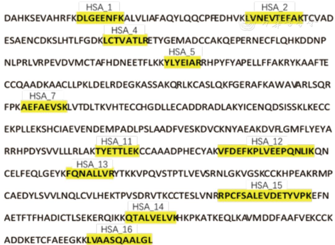 文章来源:中华检验医学杂志,2019,42(11): 904-908 作者:曾洁 张江涛 张天娇 摘要 由糖尿病和高血压导致的慢性肾脏病已成为全球性公共健康问题,尿白蛋白是慢性肾脏病诊断和分级的关键指标之一,已在临床上广泛使用。尿白蛋白检测结果的准确可比是临床应用的重要基础。本文讨论了尿白蛋白检测现状和标准化工作推进情况,以期帮助实验室正确解读检测结果,促进诊断产品质量提高。 尿白蛋白(urine albumin,u-ALB)微量升高是糖尿病肾病一个早期且敏感的指标,能预测糖尿病患者的死亡率[1]。现已在临床上广泛应用于各种原因所致肾脏损伤的诊断、分期和预后评估,以及心脑血管疾病的风险评估[2]。临床在应用u-ALB时,最理想的样本是24 h尿,但24 h尿难以收集。随机尿能良好地替代[3],KDIGO和美国糖尿病协会等指南都指出可以使用随机尿[4,5],并以ACR报告结果。当随机尿ACR≥30 mg/g时,需用晨尿做进一步确认[4]。若需要更准确的结果,则可以收集一段时间的尿样,评估白蛋白排泄量[4]。 人体中完整的白蛋白由585个氨基酸组成[氨基酸序列见图1,为便于后文对质谱法的描述,图1中肽段编号方式参照了美国国家标准与技术研究所(National Institute of Standards and Technology,NIST)的编号[6]],是单链蛋白,其三维结构呈"心"型,有3个球形结构域。白蛋白肽链内部有17对二硫键和一个未配对的胱氨酸残基(Cys 34)。尿液中除了有完整结构的白蛋白外,还有以其他形式存在的白蛋白,包括聚合物类[7]、分子量各异的白蛋白片段[8]、N末端或C末端缺失部分氨基酸的白蛋白[9]、非免疫反应性白蛋白(immunochemically nonreactive albumin或者immuno-unreactive albumin)[10];此外,由于白蛋白是人体主要的运载蛋白,有多个药物结合位点,可能存在与药物结合的白蛋白。