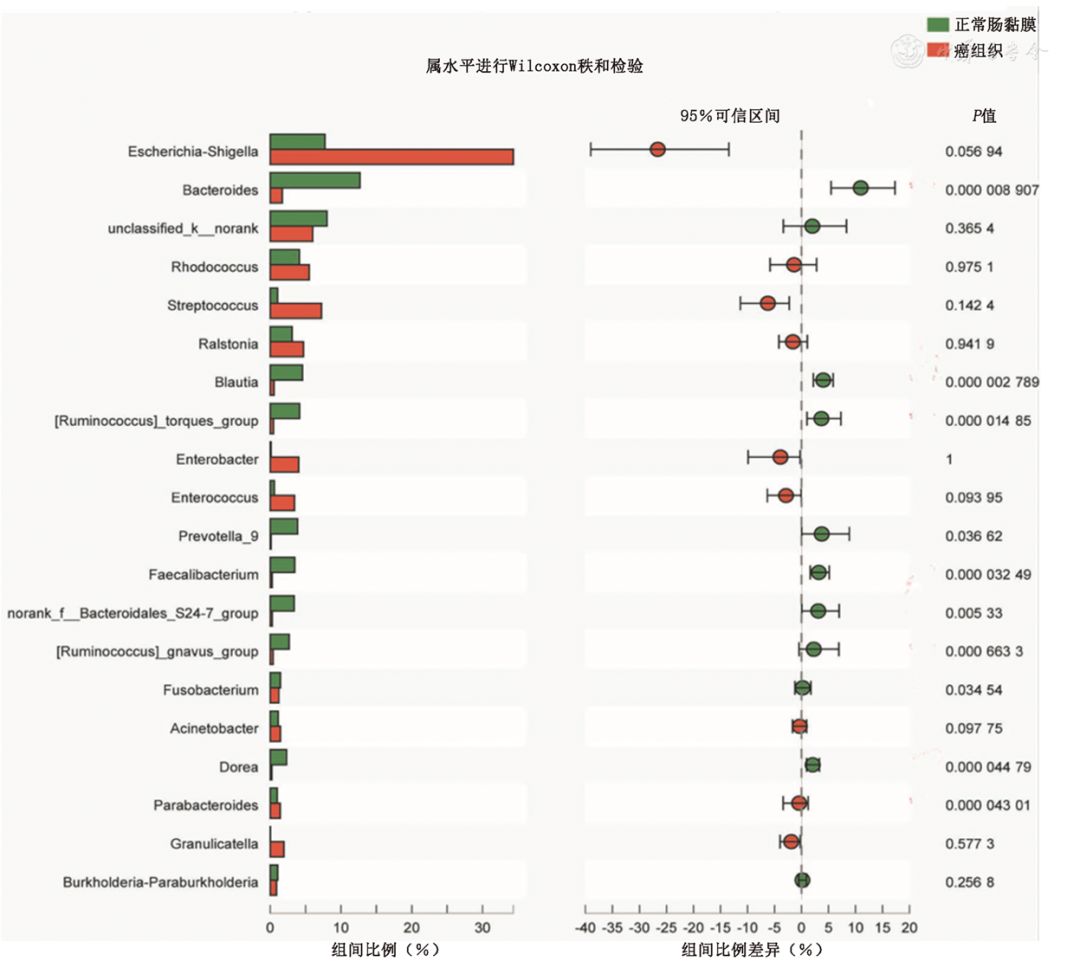 图1 正常肠黏膜与癌组织定植菌群在门水平差异性检验 二、正常肠黏膜组织与结直肠癌组织定植菌群结构在属水平上的比较 在细菌属水平,测序结果显示癌组织有许多菌属明显低于正常肠黏膜组织,其中存在显著性差异的主要菌属为拟杆菌属(Bacteroides)、布劳特菌属(Blautia)、扭链胃球菌属(Ruminococcus torques)、普雷沃菌属(Prevotella)和普拉梭菌(Faecalibacterium)(Z=-3.008,P<0.05);而紫单胞菌科Parabacteroides在癌组织中的丰度比正常肠黏膜组织显著增加,差异有统计学意义(Z=-1.997,P<0.001),如图2所示。