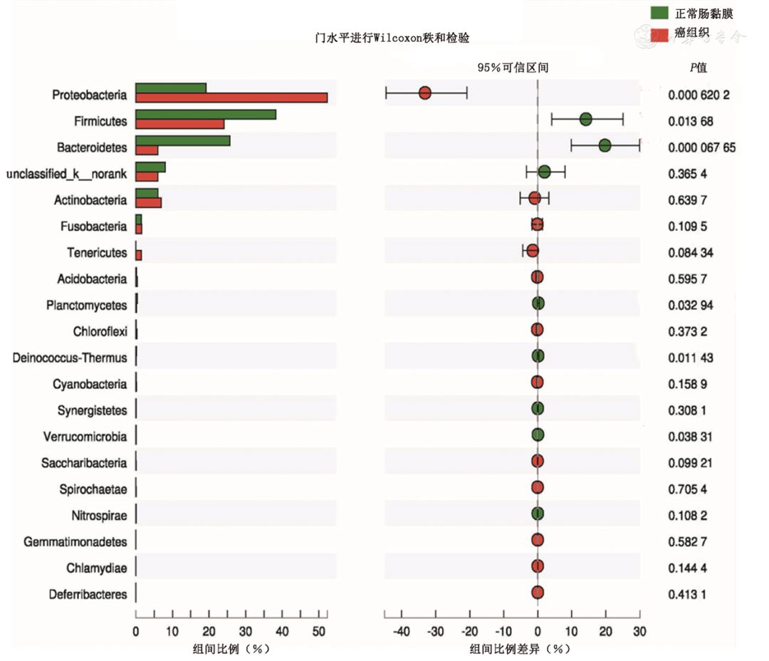 2 结 果 一、正常肠黏膜组织与结直肠癌组织定植菌群结构在门水平上的比较 在人类肠道定植菌群中,细菌门的群类是相当保守的,可以直接反映出不同组织部位定植菌群结构的异质性。在分析肠道定植菌群组分的时候,门也是最高的分类单元,门的群类是非常保守的,因此应该首先说明细菌门的相对丰度的变化规律。