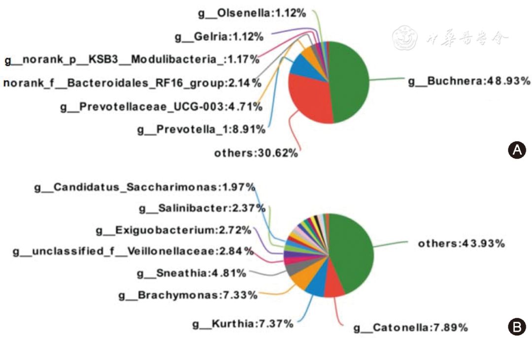 图4 PLS-DA为基础的所有样本的聚类分析 四、正常肠黏膜组织与结直肠癌组织定植菌群组分分析 在细菌属水平上,测序结果显示有的菌属仅定植于正常肠黏膜组织,其中丰度排前3位的是布赫纳什菌属(Buchnera)、普氏菌属(Prevotella)和普雷沃菌科(Prevotellaceae),分别占48.21%、30.62%和8.91%(图5A);测序结果显示有的菌属仅定植于癌组织,丰度排前3位的是卡氏菌属(Catonella)、库特菌属(Kurthia)和单胞菌属(Brachymonas),分别占7.89%、7.37%和7.33%(图5B)。