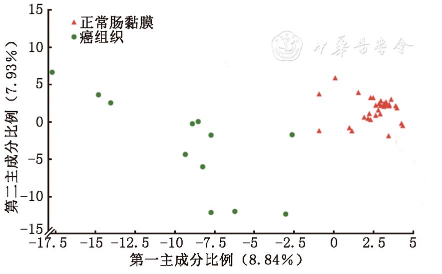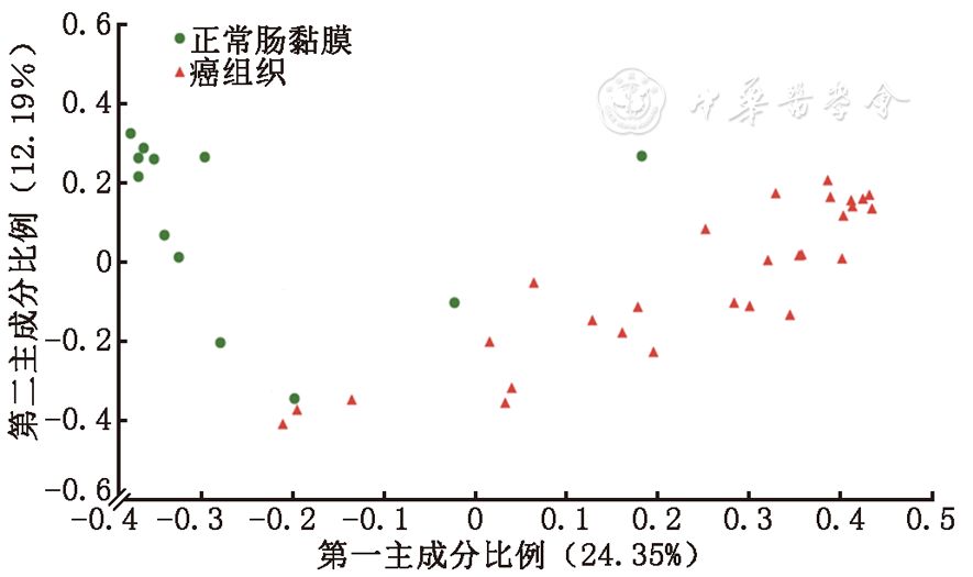 1 对象与方法 一、对象 研究对象为2016年1月至2017年10月同济大学附属同济医院病理确诊的CRC患者28例,其中男20例,女8例,年龄(56.7±8.4)岁;健康对照组12名,其中男8名,女4名,年龄(49.5±7.6)岁。均在结肠镜下取肠道黏膜活检样本(约1 mm×2 mm)。所有患者在采样前1个月均未使用过抗生素药物。所有志愿者都居住在上海地区,无特殊饮食习惯,采样前无肝、胆、胰腺等消化系统疾病史。以上40份组织用生理盐水冲洗表面,收集于冻存管内,然后放置在能立即速冻的没有防腐剂的液氮后储存在-80 ℃冰箱内。