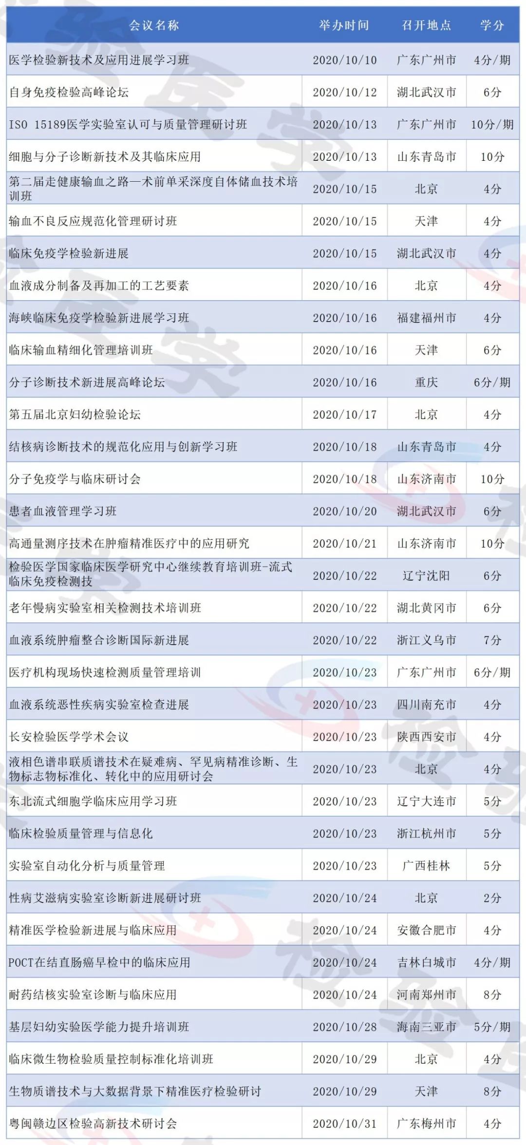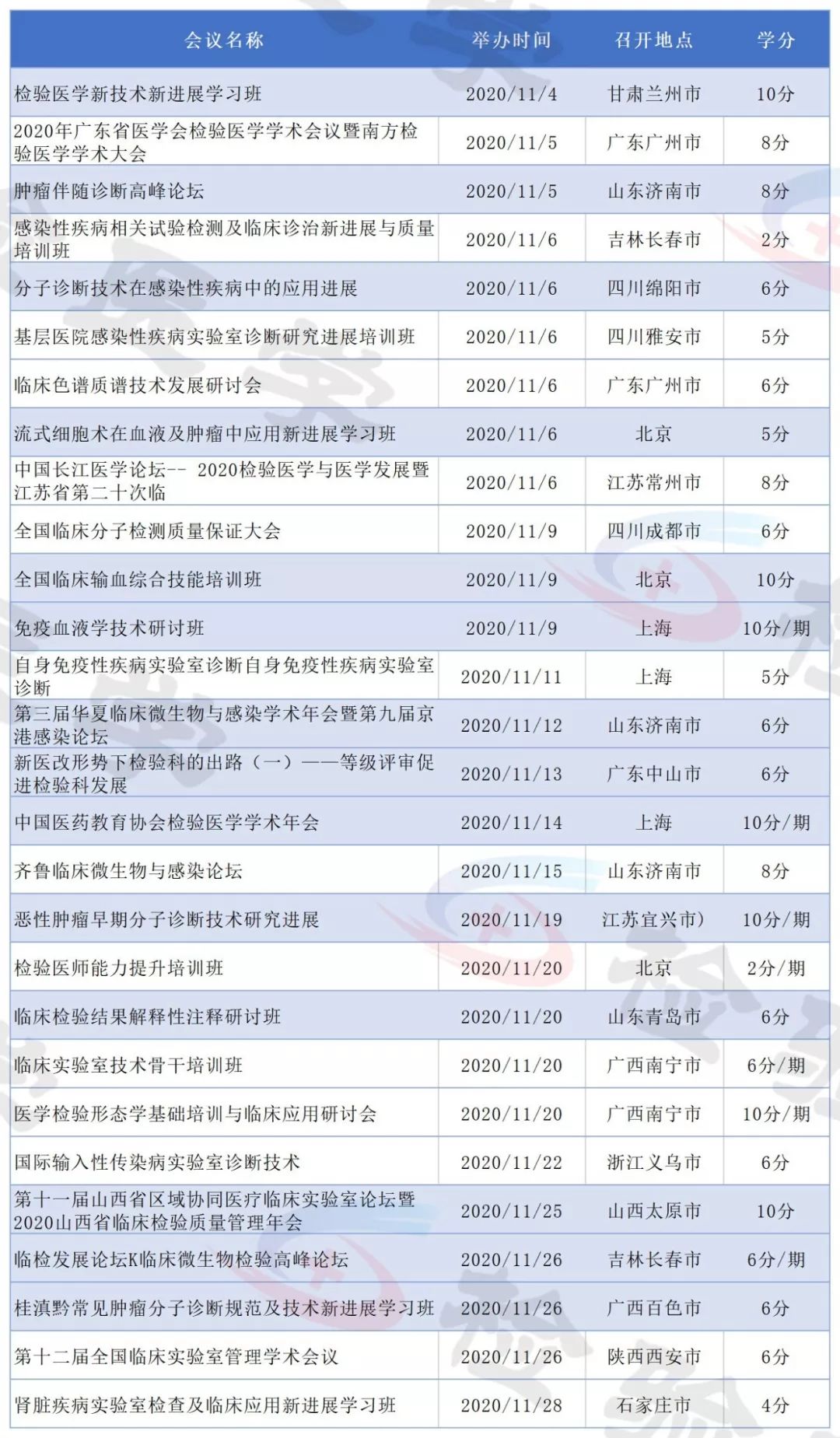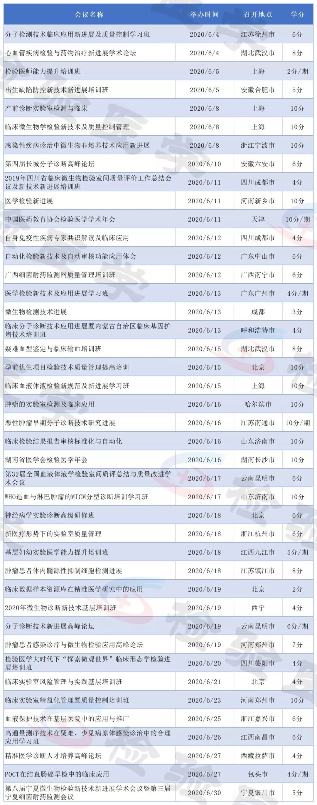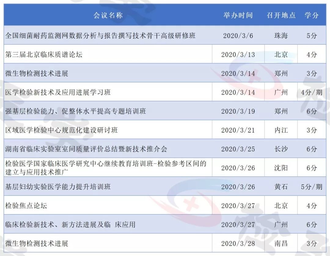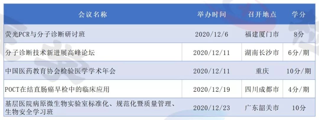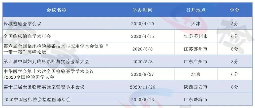 2019年即将结束,今天检验君为大家整理2020年即将召开的检验医学学术会议列表。 有感兴趣的主题或者有学分要求的小伙伴可以留意相关会议日程,合理安排调休,方便参会。 不方便外出参会的可以留意自己所在省市的学术会议。本合辑后续还会继续更新。 点击图片放大查看 点击图片放大查看 点击图片放大查看 点击图片放大查看 点击图片放大查看 点击图片放大查看 点击图片放大查看 点击图片放大查看 点击图片放大查看 点击图片放大查看 点击图片放大查看 点击图片放大查看 以上所有会议均为医学检验类国家级继续教育项目,授国家级继续教育学分。 部分会议/培训班2020年度将举行多次,学分为每期单独计算。 部分会议举办时间地点可能会有变化,请留意具体会议通知。 本文未能包含2020年度所有检验学术会议,后续会继续更新。个人有补充可以文末留言。 |