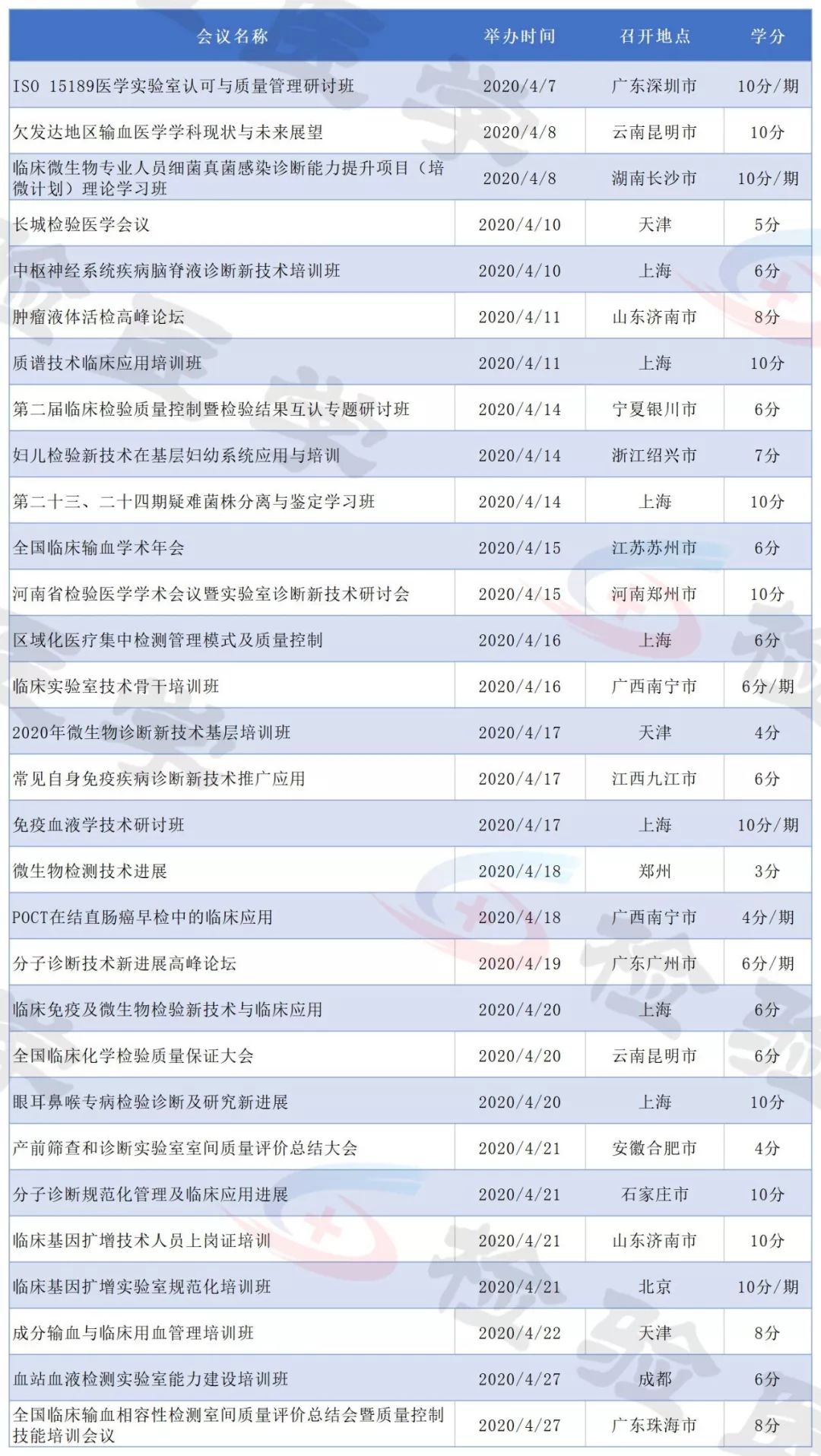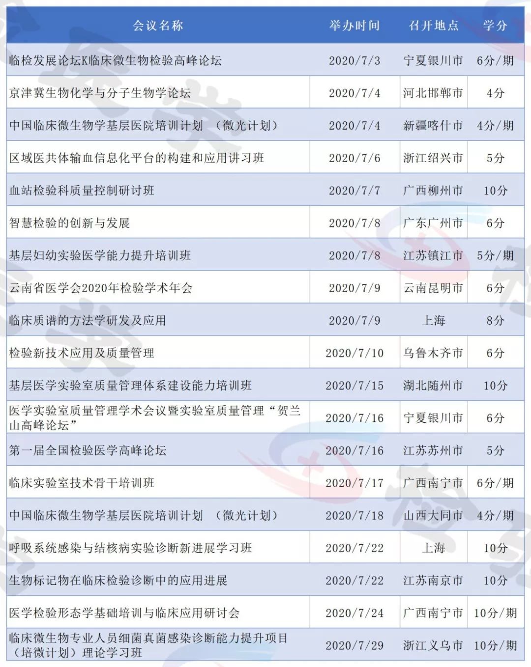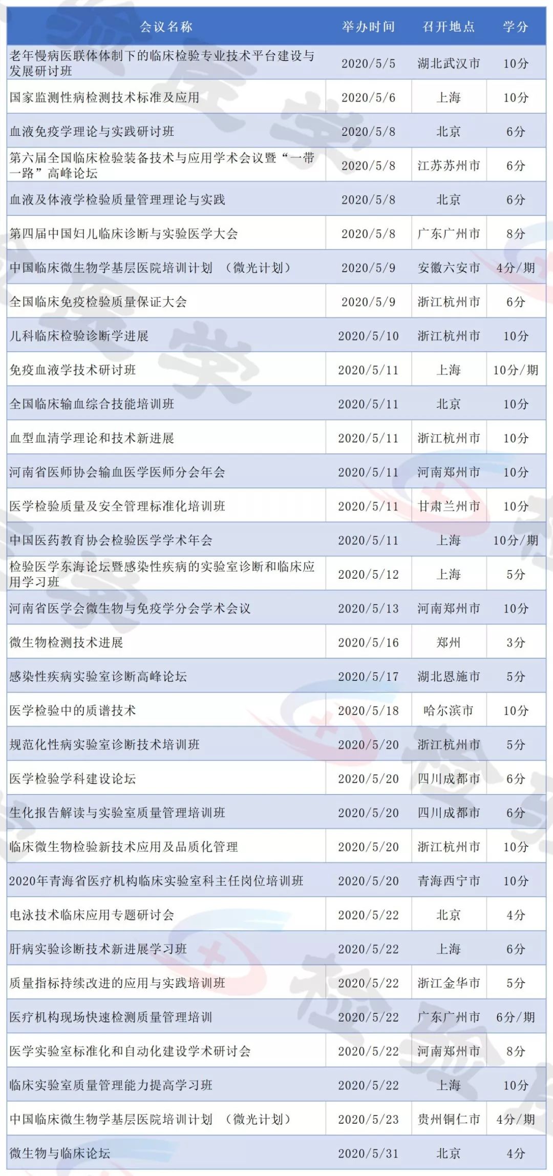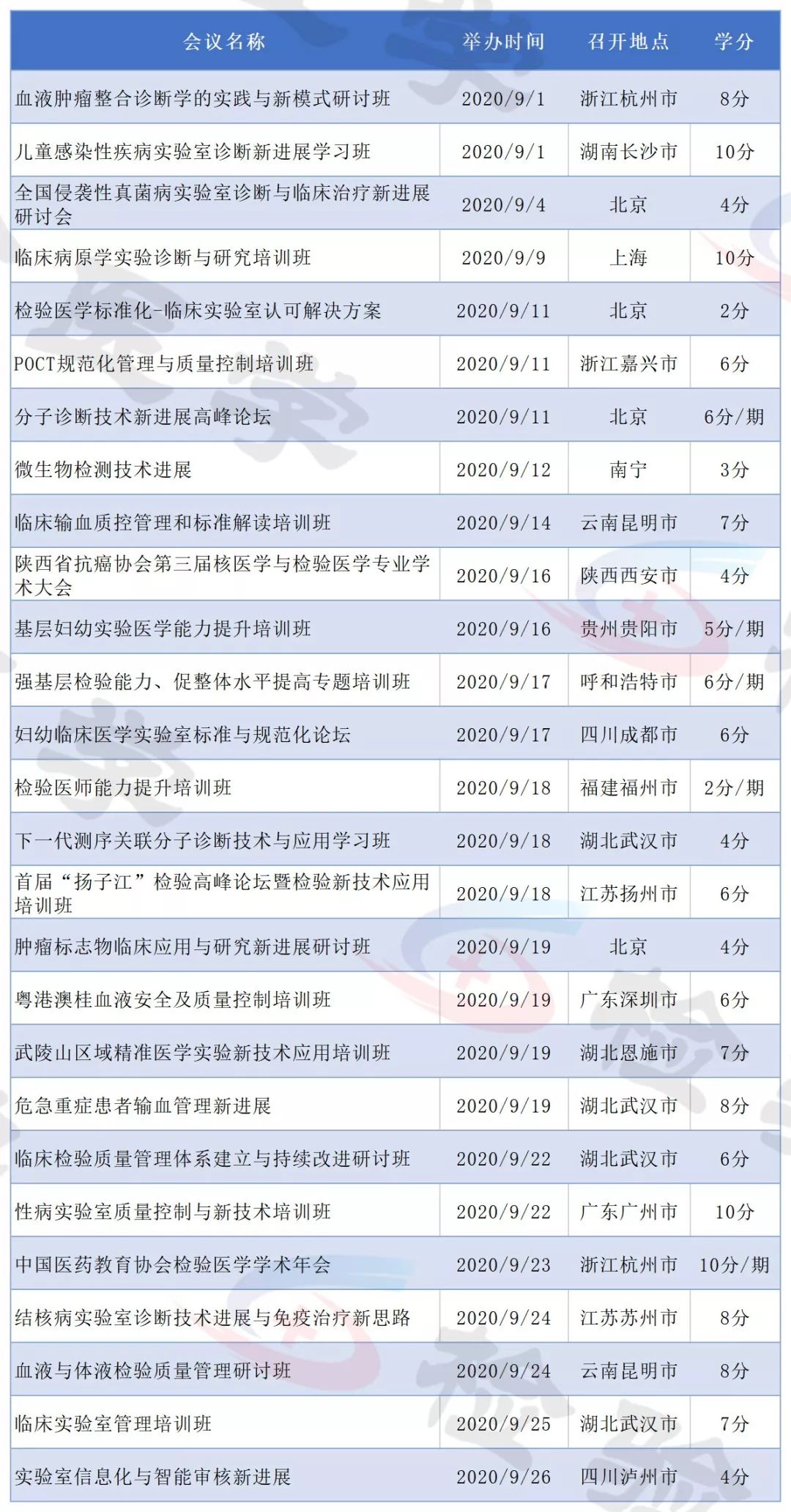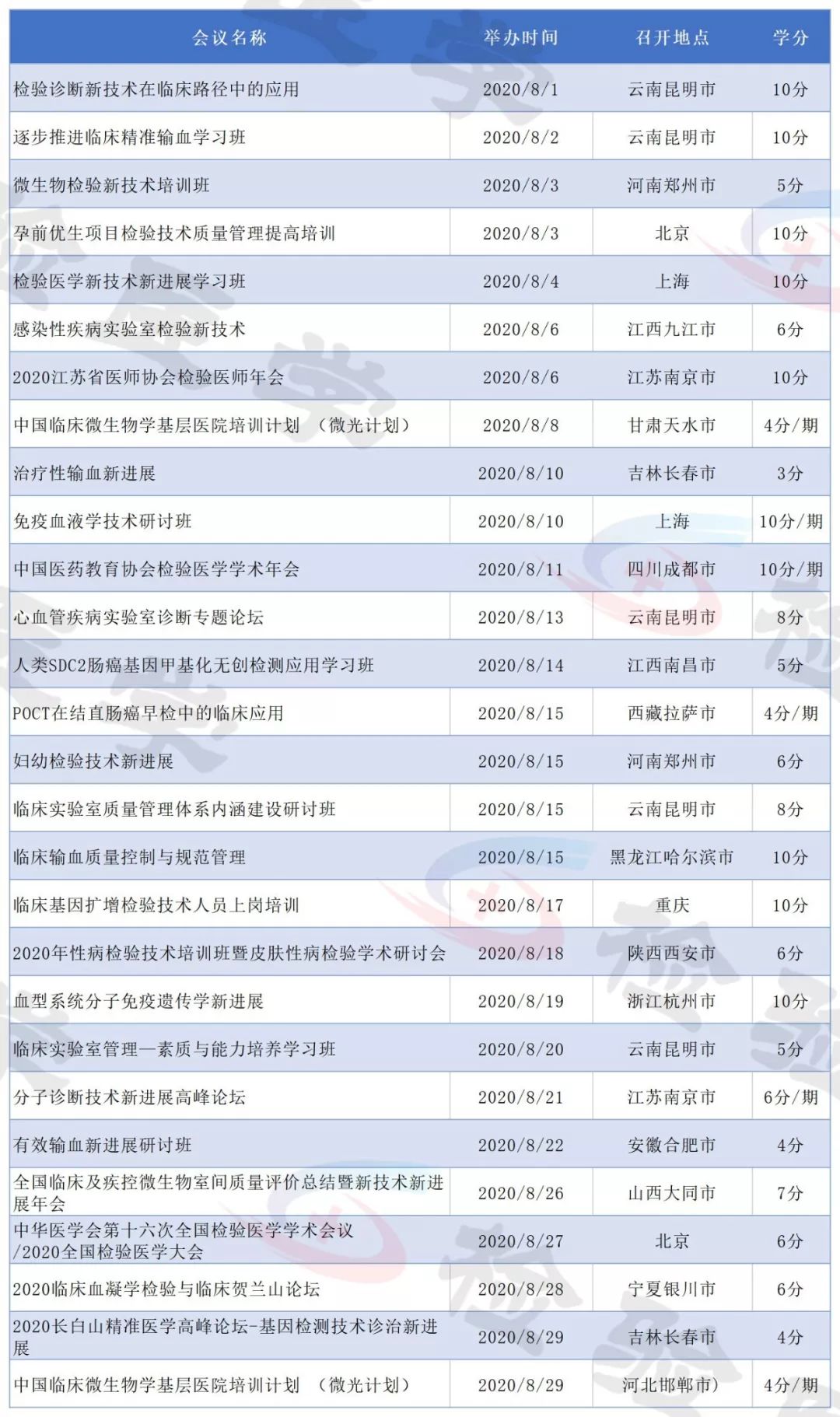2019年即将结束,今天检验君为大家整理2020年即将召开的检验医学学术会议列表。 有感兴趣的主题或者有学分要求的小伙伴可以留意相关会议日程,合理安排调休,方便参会。 不方便外出参会的可以留意自己所在省市的学术会议。本合辑后续还会继续更新。 点击图片放大查看 点击图片放大查看 点击图片放大查看 点击图片放大查看 点击图片放大查看 点击图片放大查看 点击图片放大查看 点击图片放大查看 点击图片放大查看 点击图片放大查看 点击图片放大查看 点击图片放大查看 以上所有会议均为医学检验类国家级继续教育项目,授国家级继续教育学分。 部分会议/培训班2020年度将举行多次,学分为每期单独计算。 部分会议举办时间地点可能会有变化,请留意具体会议通知。 本文未能包含2020年度所有检验学术会议,后续会继续更新。个人有补充可以文末留言。 |