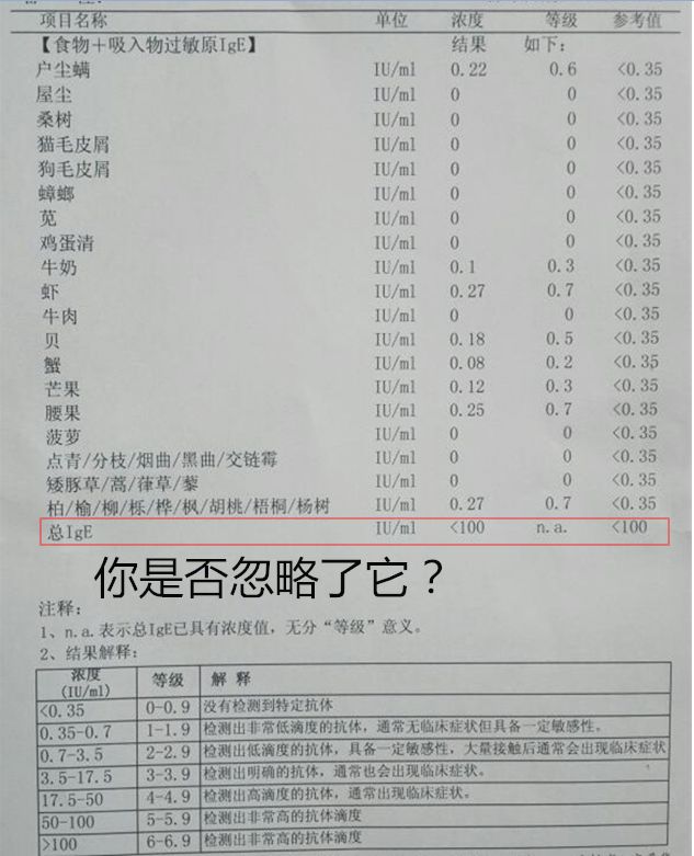 在做这项检查时,我们往往只关注那些特异性IgE测定,即看看我们到底是什么过敏,而忽略了一个重要的项目,那就是总IgE测定,总IgE值的高与低,大有学问。