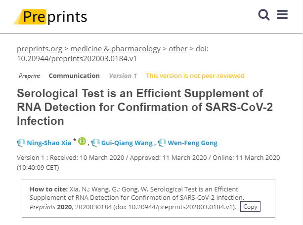 ![]() ![]() 本文为转化医学网原创,转载请注明出处 作者:竹子 导读:目前检测新型冠状病毒感染的方法依赖于特定的基因序列,根据SARS-CoV-2基因组的快速测序和COVID-19爆发早期的数据分布,研究人员开发出多种测定方法。现如今研究人员设计针对病毒抗体的血液检测,这一进展将是监测病毒传播的重要下一步。 近日,预印本网站Preprints上发表一篇重要结果,研究表明病毒RNA检测与血清学检测相结合,既能提高诊断的敏感性,又能保持较高的特异性。SARS-CoV-2特异性血清检测对临床实践和公共卫生具有重要价值。 ![]() 2020年3月7日,世界卫生组织(WHO)宣布,超过90个国家/地区/地区报告了超过10万例(包括来自中国的8万例)和3400多例COVID-19死亡。鉴于COVID-19的迅速传播,世界卫生组织于2020年2月28日将COVID-19的风险水平从“高”提高到“非常高”,以及呼吁各国高度重视对COVID-19流行的预防和控制。 迄今为止,病毒RNA检测几乎是证实SARS-CoV-2感染的唯一方法。但由于多种原因导致RNA检测灵敏度低,给疾病控制提出了严峻挑战。研究人员采用了化学发光法、酶联免疫吸附试验(ELISA)、胶体金法检测血清总抗体(Ab)和免疫球蛋白(IgM)抗体。结果表明,三种方法对总Ab和IgM检测的敏感性和特异性均较高,与IgM相比,Ab检测的敏感性更高。 ![]() 不同方法检测总抗体(Ab)和免疫球蛋白M(IgM)抗体的敏感性和特异性 注意事项:(1)括号内数据:阳性数/受检人数;(2)括号内数据:阴性数/健康受试者人数。 深圳市第三人民医院、厦门大学等单位确认患者接受了抗SARS-CoV-2的Ab、IgM和IgG检测后,结果表明,RNA和Ab试验的联合应用可以提高诊断的敏感性,同时保持较高的特异性,这被认为对临床实践和公共卫生具有重要价值。 新加坡的研究人员首次应用Ab检测追踪COVID-19接触者。在无症状的核酸阴性接触中检测到抗体后,成功地追踪到了感染源,并确定了两个群集病例之间的联系。这一突破性发现也证实了血清学检测对于追踪隐性感染的来源具有重要意义。 我国《2019年冠状病毒病诊治方案》(第七版)指出,恢复期IgM、IgG的血清阳性率、IgG的血清转化率或血清IgG滴度较急性期增加4倍以上,是确诊病例的致病证据。总的来说,用于总抗体检测的双抗原夹心法比μ捕获法(常用于IgM抗体检测)和间接ELISA法(常用于IgG抗体检测)具有方法学上的优势: 1)同时检测IgM、IgG、IgA等多种抗体; 2)检测要求抗体分子的两个Fab片段分别与包衣抗原和标记抗原结合,这一特性显著降低了包衣抗原和标记抗原中的异质蛋白引起的非特异性结合,从而保证了较高的特异性。 3)由于外源蛋白在抗原中的干扰非常有限,提高包被抗原和标记抗原的浓度可以进一步提高检测的灵敏度。总抗体在保持特异性的同时,可提高诊断敏感性,是一种较好的早期诊断血清学指标。 总体上,ELISA法和化学发光法检测Ab具有取样方便、高通量、高效、可定量或半定量的特点,胶体金法是一种实时、重点检测的方法。以上抗体检测方法应作为不同情况下RNA检测的有效补充,以提高诊断的敏感性和特异性。Ab测试的应用可概括如下: 临床病人和密切接触者的筛选和管理:1)对RNA检测阴性的疑似病人和临床诊断病人,Ab阳性者可作COVID-19诊断;2)Ab阳性者,应将无症状密切接触者视为当前携带者或既往感染者。对于近距离接触,如果在检疫14天内,上呼吸道标本的RNA检测仍为阴性,Ab阳性意味着检疫观察的时间更长,应考虑下呼吸道和粪便标本的进一步采集和核酸检测;3) Ab试验可用于定量测定恢复期患者血浆抗体水平,认为高滴度抗体血浆有助于重症COVID-19患者的治疗。 重点人群筛查:结合RNA和Ab检测,可对COVID-19高发国家或地区的旅客、重要会议或活动的参与者、从高发地区返回工作或学校的人群进行筛查。对抗体阳性、RNA阴性的人群,也可进行检疫和健康监测,及时发现潜在病例,降低传播风险。 流行病学研究:1)将血清学检测与核酸检测及临床症状相结合,对SARS-CoV-2感染进行全谱分析,揭示隐性感染、非典型感染、轻症感染、重症感染的分布,以及每种感染对病毒和疾病传播的贡献;2)进行人群血清学调查,了解不同地区、不同人群,如不同年龄、不同职业、不同基础疾病人群中SARS-CoV-2感染的实际流行率和致病性,因此,建议适当的疾病控制干预措施;3)从疑似病例或确诊病例和血清学指标测试,核酸指标和其他实验室指标,分析其动态,从而完善COVID-19的诊断和治疗策略;4)分析恢复期COVID-19患者的抗体水平和抗体表位谱,为今后疫苗和治疗性抗体的设计和评价提供科学指导;5)支持寻找SARS-CoV-2潜在的动物宿主,因为双抗原夹心法检测出的总抗体不限于物种。 参考资料: Ningshao Xia et al. Serological test is an efficient supplement of RNA detection for confirmation of SARS-CoV-2 infection. Preprints. 10 March, 2020. |