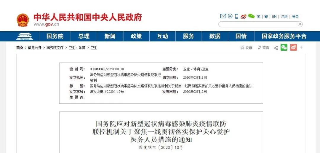 来源:中国政府网 3月12日,国务院应对新型冠状病毒感染肺炎疫情联防联控机制发布了《关于聚焦一线贯彻落实保护关心爱护医务人员措施的通知》(以下简称“通知”)。 “通知”表示:为广大一线医务人员全身心投入疫情防控工作中,国家多次发布通知,给一线医务人员提供了多重保障与激励机制。但一些地方在执行和落实中,存在对象不精准、执行不严格、工作不规范、落实不到位等问题。