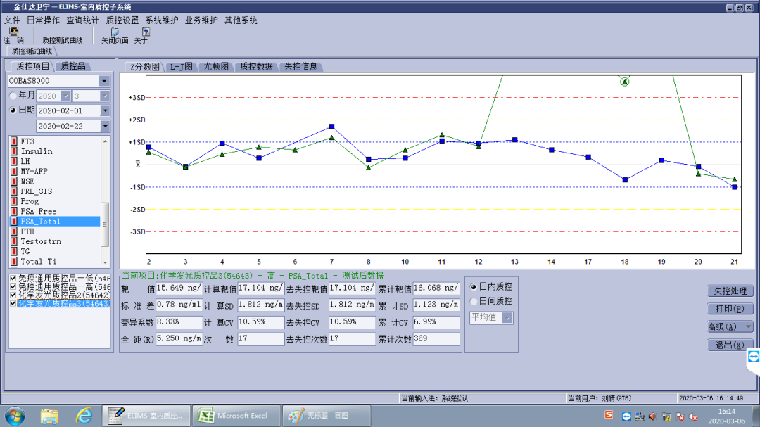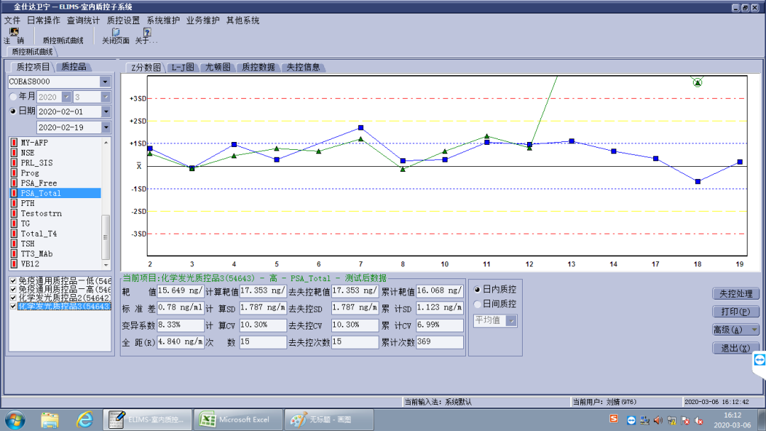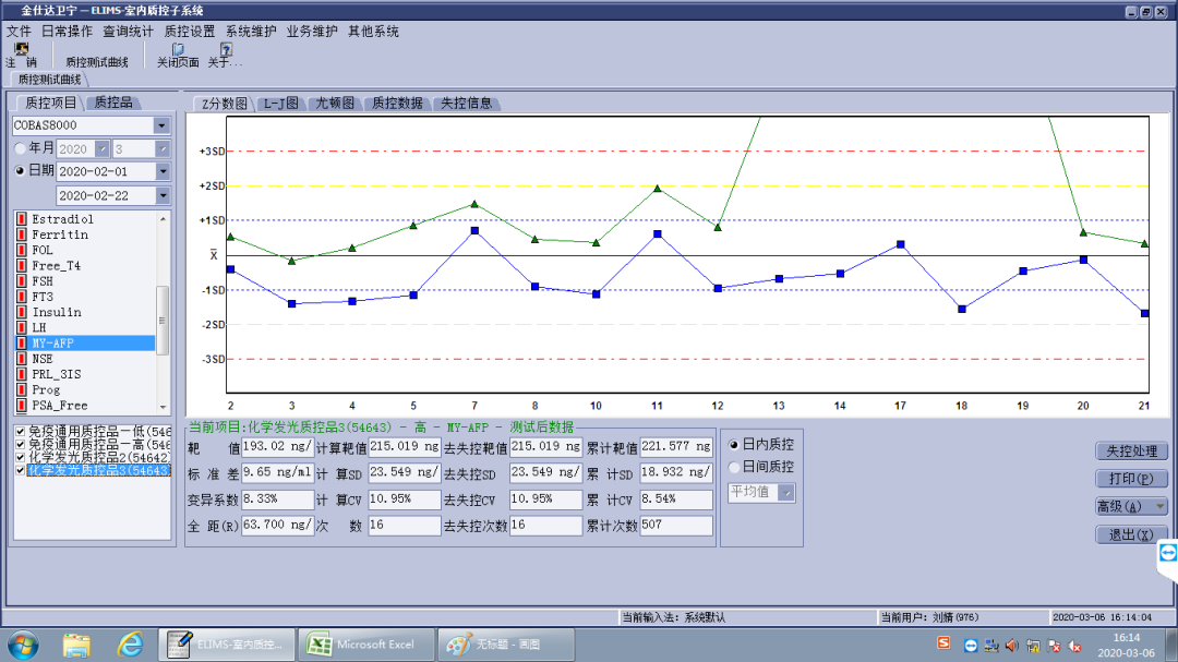 时间一分一秒的过去了,不能耽误病人发报告的时间呀,赶紧拿来罗氏的肿瘤标志物质控来做比对,结果让人松了一口气,罗氏质控都是在控的。然后抱着侥幸的心理想着第二天再看看吧,也许是偶然误差呢。 第二天一来,首先把质控给做上,结果还是让人大失所望,高值仍然漂到了+3SD之外。用罗氏质控做仍是在控的,今天结果照发,心想着是不是管路脏了,要做两周保养了?然后下午执行了两周保养,等到周一再来重新做质控。 周一一大早又重新融冻两瓶配制好的伯乐中高值质控(我们是每次配制一瓶质控品然后分装成5小瓶在-20℃下保存),结果仍然让人崩溃! ![]() ![]() 不能闭门造车了,要请教高人了。赶紧找到我们科的江主任,把事情原委跟他说了一遍,主任分析说,两个质控品同时操作,一个没问题,一个出现问题,完全可以排除系统误差。 仔细回想一下在给质控品加去离子水过程中可发生什么意外或突发状况,如果没有,我给你几点建议:1、重新开一盒质控品;2、保证绝对准确加去离子水的量。 本人是用加样枪来加去离子水,主任提醒到,中值质控品结果没问题,仅仅是高值有问题,那就可以排除去离子水变质。 检查一下加样枪,可能是加样量不准确,或者加样枪头漏气造成加样不准确,导致质控结果偏高。那用什么加样比较准确呢?主任说道可以用玻璃移液管呀! 是的,我立马从科室库房找出了现在已经不用的5毫升的玻璃移液管,用清洗剂洗过两三遍后再用去离子水冲洗两三遍,准确吸取2毫升的去离子水重新配置高值质控品,上机重新进行质控。 半小时后结果出来了,高值又重新恢复正常了,心中的大石头终于放下了。原来是加样枪的偶然漏气造成高值质控品加去离子水的量不够。 下面是重新做的三个项目质控图: