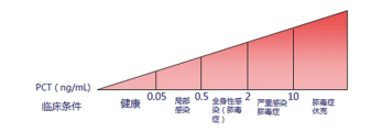 但在细菌感染时,除甲状腺外,肝脏的巨噬细胞和单核细胞,肺、肠道组织的淋巴细胞及内分泌细胞都能合成分泌PCT,此时血清PCT水平会明显升高,且随感染进展或控制而持续在高水平或逐渐下降。 生成PCT和降钙素的过程开始于转录141个氨基酸组成的多肽-前降钙素原,它由一个信号序列、PCT的N端、降钙素序列、PCT的C端组成。 当信号序列介导前降钙素原被内质网摄取后,信号序列被降解,剩余的蛋白质即为PCT。若蛋白质溶解,降钙素即从PCT中分离;但在内毒素或某些细胞因子的干预下,这一蛋白质溶解过程可被抑制,此时PCT及其片段被释放进入循环。 健康人的血浆PCT质量浓度低于0.05 ng/ml。老年人、慢性疾病患者、以及不足10%的健康人血浆PCT质量浓度高于0.05 ng/ml,最高可达0.1 ng/ml,但一般不超过0.3 ng/ml。 可以确定的是,对于细菌、病毒临床上难以区分时,PCT的高低可以发挥一定的鉴别诊断作用。 降钙素原合成途径在不同的炎症状态中有所不同。在没有全身性炎症的情况下,降钙素原合成仅限于甲状腺神经内分泌细胞,并且蛋白质在被切割成成熟形式降钙素之前不会释放到血液中。当全身性炎症由细菌感染引起时,在几乎所有组织中诱导降钙素原合成并释放到血液中。
