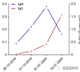 Zhou等在《Nature》报道称新冠病毒感染者18天体内IgM抗体开始下降,IgG抗体开始上升(见下图)