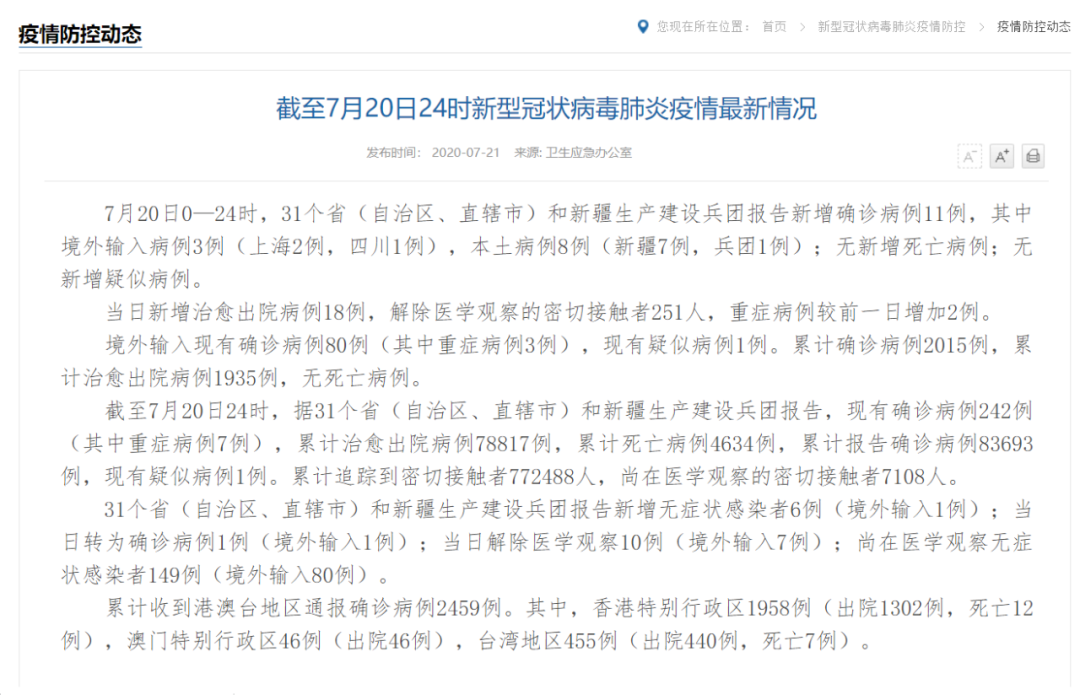 7月20日0—24时,31个省(自治区、直辖市)和新疆生产建设兵团报告新增确诊病例11例,其中境外输入病例3例(上海2例,四川1例),本土病例8例(新疆7例,兵团1例);无新增死亡病例;无新增疑似病例。