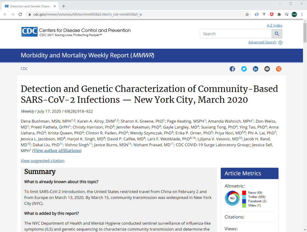 美国疾控中心 (以下简称美CDC) 于2020.7.17日傍晚,在其官网www.cdc.gov 发布了一篇关于美国新型冠状病毒肺炎的样本溯源分析报告。报告用翔实的证据和数据,证明了美国的新冠疫情爆发:美CDC官网原文网址:https://www.cdc.gov/mmwr/volumes/69/wr/mm6928a5.htm?s_cid=mm6928a5_w【概要】美CDC于今年的3月初到中旬,在纽约的测试点,取得了美国新冠患者的病毒毒株(总计采样了544个样本,其中36个为阳性),并对这些样本的毒株进行了基因类型的检测分析,再用这些样本的检测结果,和全世界的其他国家的病毒毒株基因序列进行对比,对比试验的最终结果是:这些病毒毒株和中国武汉的病毒毒株,没有任何关系!美国疾控中心甚至在报告中用了“This was unanticipated” 这样的词汇来描述他们的“惊讶”!纽约是美国暴发疫情较早和人数最多的地区之一,纽约的病毒样本,很大程度能代表全美国的病毒发展状况。 美CDC在病毒采样的时候,特意选择了在美的华人聚集区域(当地居民说中文的人数大于总人数的20%)的医院,此举表明美CDC在采样之初,就已经有很强的针对性,在采样之前就已经预设推定美国的病毒传播和华人有关。