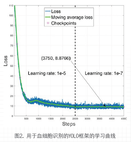 第1-2500步的学习速率是10-5,第2501-4500步的学习速率是10-7。结果发现,在第2501-4500步采用较低的学习速率可以实现更好的收敛(convergence)。我们每隔125步记录一次权重并评估模型。图2是用损失函数表示的YOLO血细胞检测算法的学习曲线。