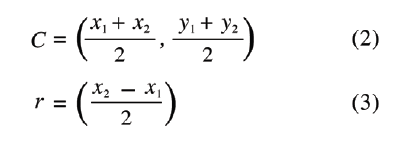 鉴于左上角和右下角坐标分别是(x1,y1)和(x2,y2),因此,用于标记细胞的圆形的中心点C和半径r可以计算为: