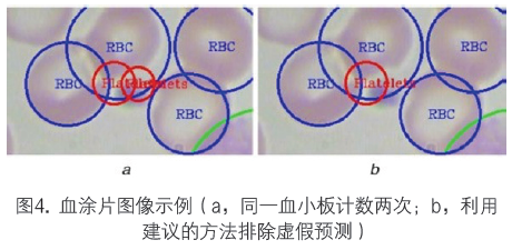 依据经验,血小板与邻近血小板之间的允许重叠度是10%。如果重叠度大于10%,我们将忽略该细胞的重复计数,以排除虚假计数。图4表示血小板被YOLO算法计数两次的情况。利用KNN和IOU技术可以解决重复计数问题。