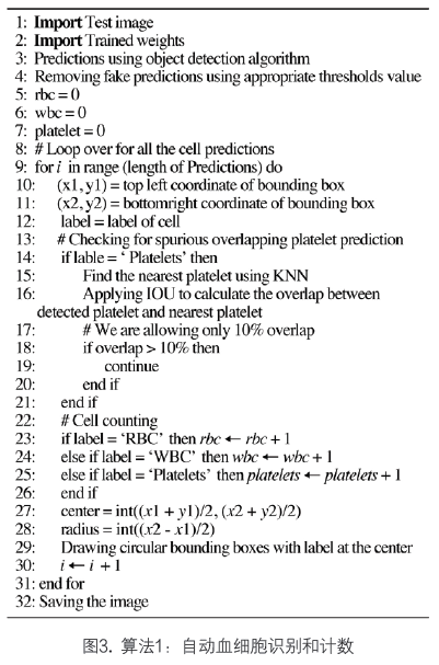 在某些情况下,它会重复计算血小板的数量。我们通过对每个血小板应用K近邻算法(KNN)和交并比算法(IOU)来解决这一问题。总而言之,YOLO血细胞识别和计数方法既快速又准确。该方法的步骤如算法1(见图3)所述。