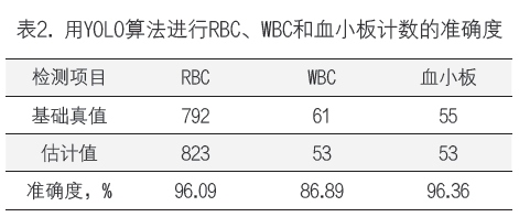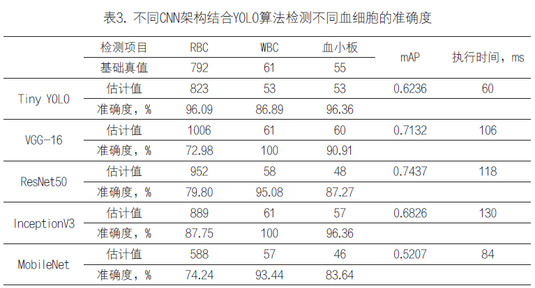 从图中可以看出,InceptionV3和ResNet50的误差最小。测试集中RBC、WBC和PLT计数的准确度如表3所示。从表中可以看出,使用Tiny YOLO架构对RBC和PLT进行计数的准确度最高,其中RBC计数的准确度达到96.09%,PLT计数的准确度达到96.36%。