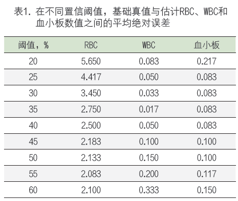 从表中可以看出,RBC计数的阈值是0.55。而WBC和PLT的阈值则低得多(在我们的实验中分别是0.35和0.25)。因此,每种细胞的阈值被选定为: (1)RBC:置信阈值为55%; (2)WBC:置信阈值为35%; (3)PLT:置信阈值为25%。
