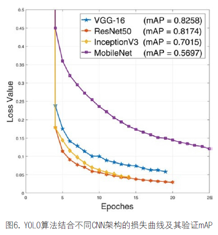 我们用VGG-16、ResNet50、InceptionV3和MobileNet CNN架构替代YOLO算法的内置CNN。为了在后端用这些网络训练YOLO,我们将训练集分成两部分。前250幅带注释的图像用于训练,后50幅图像用于验证。对于所有网络,训练的损失曲线及验证的平均精度均值(mAP)如图6所示。