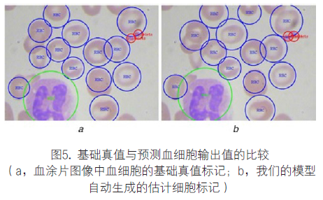 为了形象化地比较基础真值与YOLO方法的输出值,图5表示来自测试集的一个样品血涂片图像。从图中可以看出,所有WBC和PLT计数均无误。该方法漏掉了中间的一个RBC,但是检测到图像边缘的另一个RBC(不包括在基础真值中)。