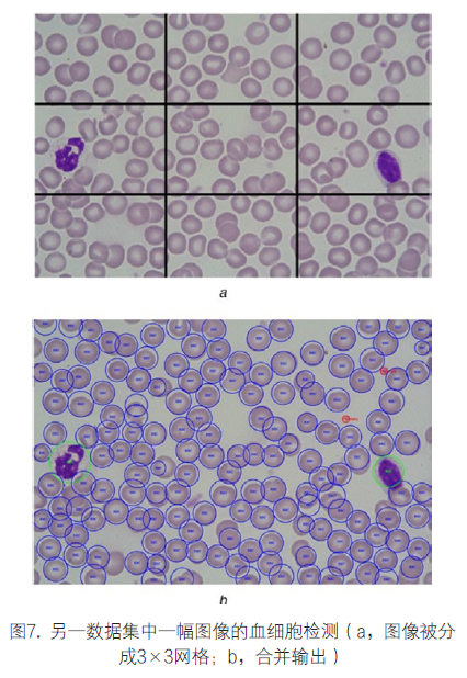 然后将每幅子图像的检测和计数投射到原图像上。图7表示一幅被分成3×3网格的血涂片图像,也就是用建立的方法处理9幅子图像。从图中可以看出,输出图像正确识别了RBC、WBC和PLT,性能令人满意。