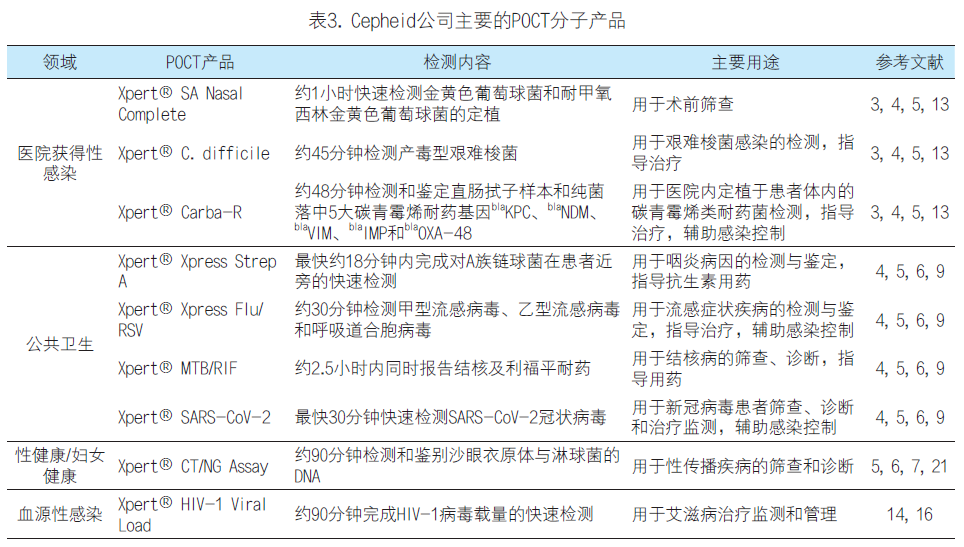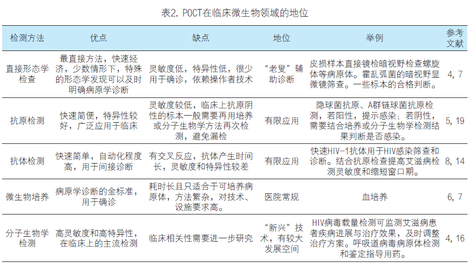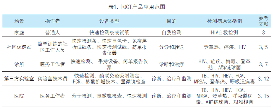 一、POCT在临床微生物领域中的应用 目前在临床微生物领域的主要检测方法平台有直接形态学检查、抗原检测、抗体检测、微生物培养、分子生物学检测。直接形态学检查包括肉眼或显微镜观察,主要用于初筛并提示进一步检查方向,临床上应用广泛,其优点是快速经济,缺点是灵敏度低,很少用于确诊;抗原检测在临床上广泛应用于床边检测,其优点是快速简单,特异性较好,缺点是灵敏度低;抗体检测主要用于流行病学调查和回顾性诊断,缺点是有交叉反应,灵敏度和特异性较差;微生物培养主要包括琼脂肉汤等无生命培养基和组织细胞等有生命培养基培养,是病原学诊断的金标准,其优点是灵敏度和特异性高,用于确诊并提供进一步分析,缺点是耗时长且只适合于可培养病原体;分子生物学检测可用于定性或定量检测,临床应用较为广泛,其优点是高灵敏度和高特异性,缺点是对实验室硬件设施、技术人员要求较高,检查结果的解释和临床应用指导也较为复杂[4-6]。 POCT临床微生物检测主要应用于抗原、抗体和核酸检测等。POCT抗原检测主要用侧流免疫层析法,如A群链球菌抗原检测、甲型/乙型流感病毒抗原检测、幽门螺杆菌抗原检测等。POCT抗体检测在HIV、梅毒、疟疾、登革热等疾病的筛查中得到广泛应用。POCT分子生物学检测由于高灵敏性,在呼吸道病毒、结核分枝杆菌、HIV、HBV、HCV等感染病的诊断和治疗起到非常重要作用,见表2[7-9]。 二、POCT在结核分枝杆菌检测的应用 结核分枝杆菌是引起结核病的病原体。1882年由德国细菌学家Robert Koch发现并证明为人类结核病的病原菌,该菌可侵犯全身各器官,以引起肺结核最多见。结核分枝杆菌的检测仍极大程度地依赖于传统微生物实验室的显微镜检或培养方法。显微镜检方法虽简单经济,但灵敏度低和特异性低;培养方法是金标准,缺点是要求高、耗时长;结核菌素试验对活动性结核灵敏度较高,特异性较差,容易出现假阴性和假阳性结果;γ-干扰素释放试验操作复杂,费用高,不能用于活动性结核的诊断;分子生物学检测在结核病诊断中具有敏感性高、特异度强,快速等优点,可用于结核病的诊断。 由于POCT检测具有简单、快捷、高效、廉价的技术,受到人们越来越多的青睐[10]。目前结核分枝杆菌POCT检测主要集中在分子生物学方面,有Minilab结核检测、优思达结核分枝杆菌快速检测、Xpert MTB/RIF检测等,其中Xpert MTB/RIF应用最广泛,可以直接从原始痰标本中快速、敏感地检出结核分枝杆菌和利福平耐药性。同时WHO认可并推荐Xpert MTB/RIF在结核病防治规划中的应用[11, 12]。相比于其他实验室检测方法,Xpert MTB/RIF检测会显著降低结核患者开始正确结核治疗的时间,时间中位数可由7天缩短到1天[13]。 三、POCT用于HIV/AIDS的诊断及监测 人类免疫缺陷病毒(HIV)是引起艾滋病(AIDS)的病原体,HIV病毒侵入人体,能破坏人体的免疫系统,令感染者逐渐丧失对各种疾病的抵抗能力,最后导致死亡。HIV是一种逆转录病毒,其病毒颗粒呈球形,核心呈中空锥形,由两条相同的单链RNA链、逆转录酶和蛋白质组成。 HIV/AIDS诊断的主要方法有血清学检测和HIV核酸检测。最新的血清学检测涵盖了HIV抗原和HIV抗体,此检测包括初筛试验和确诊试验。初筛试验包括酶联免疫吸附试验、化学发光或免疫荧光试验、HIV快速检测。酶联免疫吸附试验多为HIV抗体检测,快速简单,但灵敏度和特异性较低;化学发光或免疫荧光试验既可检测抗体,又可以联合检测p24抗原,灵敏度和特异性较高。确诊试验常用免疫印迹试验,这也是一种抗体检测,用于HIV/AIDS的确诊,现在被另外一种酶免或分子方法所取代。HIV核酸检测主要检测HIV的病毒载量,用于抗病毒治疗的监测[14]。 POCT检测在HIV/AIDS早期筛查和诊断中应用广泛,其主要方法是侧流免疫层析。基于侧流免疫层析法的HIV POCT检测产品可用于指血全血、静脉全血、血浆或口腔标本的检测,可同时进行HIV抗原与抗体检测,第四代HIV POCT产品与参考实验室方法相比,灵敏度可达91%-100%[15]。 HIV/AIDS治疗监测的主要检测方法有HIV核酸定量检测、CD4+T淋巴细胞检测和HIV基因型耐药监测等。POCT检测在HIV/AIDS的治疗监测中常用方法是核酸定量检测,如Xpert HIV-1定量检测,其灵敏度和准确度高,帮助医生及时发现疗效和调整治疗方案[16]。HIV POCT检测产品的普及应用,可帮助AIDS患者尽早确诊和抗病毒治疗,同时可以减少AIDS传播的发生[17]。 四、POCT用于检测化脓性链球菌 急性咽炎是儿科病人和肺孢子菌肺炎患者就诊的最常见原因,小儿咽炎以病毒性咽炎居多,化脓性链球菌(又称A群链球菌)咽炎约占15%,但是临床上难以区分链球菌性咽炎和非链球菌性咽炎。由于早期鉴别能够缩短临床病程,早期治疗能够预防疾病传播及其后遗症,所以急性咽炎的早期鉴别和早期治疗是十分重要的。目前A群链球菌的实验室诊断方法主要包括: 1)咽喉拭子快速抗原检测,其缺点是灵敏度低,若检测结果为阴性,则需要病原体培养或PCR检测; 2)病原体培养检测,这种方法仍然是金标准,细菌培养后需要通过凝集试验鉴定A群链球菌。POCT检测A 群链球菌的产品有很多, 最常用的POCT检测方法是侧流免疫层析法,其中Alere i Strep A Test抗体检测、BD Veritor System抗体检测和QuikRead go Strep A抗原检测的灵敏度可达76%-100%[18]。还有A 群链球菌POCT分子检测有Cobas Liat、Luminex Aries、Xpert Xpress Strep A。与细菌培养