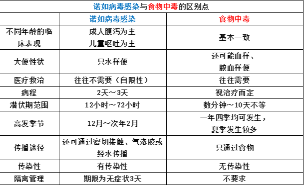 虽然诺如病毒感染属于自限性疾病,多数患者发病后无需治疗,休息2-3天即可康复,但少数病例仍会发展成重症,甚至死亡,且病毒的排泄会延续 2 周左右。 因为症状相似,具有很多相同点,所以诺如病毒感染经常被错认为是食物中毒。以下是诺如病毒感染和食物中毒的区别: 目前诺如病毒感染无疫苗和特效药物,切勿随便使用抗病毒药物,更不要服用抗生素。需要特别关注老人、婴幼儿及有基础性疾病的患者,防止发生严重并发症。 1. 勤洗双手 饭前、便后、加工食物前应按照7步洗手法正确洗手,用肥皂和流动水至少洗20秒。 以下是河南省镇平县第二人民医院检验科 徐瑞平老师编的一首关于洗手的打油诗: 一掌二背三指缝,四洗拇指五指背, 指尖揉搓不能少,最后手腕和手臂, 揉搓揉搓旋转搓,肥皂揉出小泡泡, 流水冲洗半分钟,这样洗洗更健康。 注意:消毒纸巾和免洗手消毒剂对诺如病毒无效,不能代替洗手。 2. 注意食品卫生 喝开水,蔬菜瓜果彻底洗净,烹饪食物要煮熟,尤其是海产品,鱼虾类食物尽量少碰,海产品变质或加工不当都会导致此类问题的出现。少吃或不吃地摊食品,选择卫生安全的用餐场所。 3. 患病期间居家隔离 患者需根据病情居家或入院隔离至症状完全消失后3天,检测呈诺如病毒阳性但无感染性腹泻症状的隐性感染者,也需居家隔离3天。 诺如病毒感染者患病期至康复后3天内不能准备和加工食物或陪护其他患者。 患者患病期间尽量不要和其他健康的家人近距离接触,尤其不要做饭或照顾老人和幼儿。 4. 做好消毒 对患者呕吐物或粪便污染的环境和物品需要使用含氯制剂进行消毒。 在清理受到呕吐物污染的物品时,应戴塑胶手套和口罩,避免直接接触污染物。 具体消毒方法后文有详细介绍。 5. 保持平常心,无需过度担心 诺如病毒感染性腹泻一般病情轻微,持续时间短,绝大多数预后效果良好,大家不必恐慌,尽量养成良好的习惯即可,无需过度担心。 家中一旦出现腹泻、呕吐症状的疑似诺如病毒感染病人,应尽快采取消毒措施。诺如病毒消毒推荐使用含氯消毒剂,不同的对象消毒方法也不同,具体如下: 1、病人呕吐物:配制含量为5000mg/L~10000mg/L含氯消毒液,消毒30分钟以上,用流水冲洗; 2、病人粪便:配制含量为5000mg/L~10000mg/L含氯消毒液,将粪便完全覆盖,消毒30分钟以上,流水彻底冲洗; 3、地面、墙壁:配制浓度为1000mg/L含氯消毒液,喷洒消毒喷湿即可(有肉眼可见污染物时应先清除污染物再消毒),作用时间30分钟以上; 4、衣物、被褥等织物:配制浓度为500mg/L 的含氯消毒剂溶液,浸泡30 分钟,然后清水洗净; 5、食品用具:煮沸或流通蒸汽消毒30 分钟;也可用有效氯为500mg/L 含氯消毒液浸泡30分钟后,再用清水洗净; 6、皮肤、粘膜:立即清除皮肤上的污染物,沾取0.5%碘伏消毒液,擦拭消毒3分钟以上,使用清水清洗干净,粘膜应用大量生理盐水冲洗; 7、室内空气:保持室内空气流通,无人空间也可用紫外线对空气消毒。 图片来源:广东疾控 |