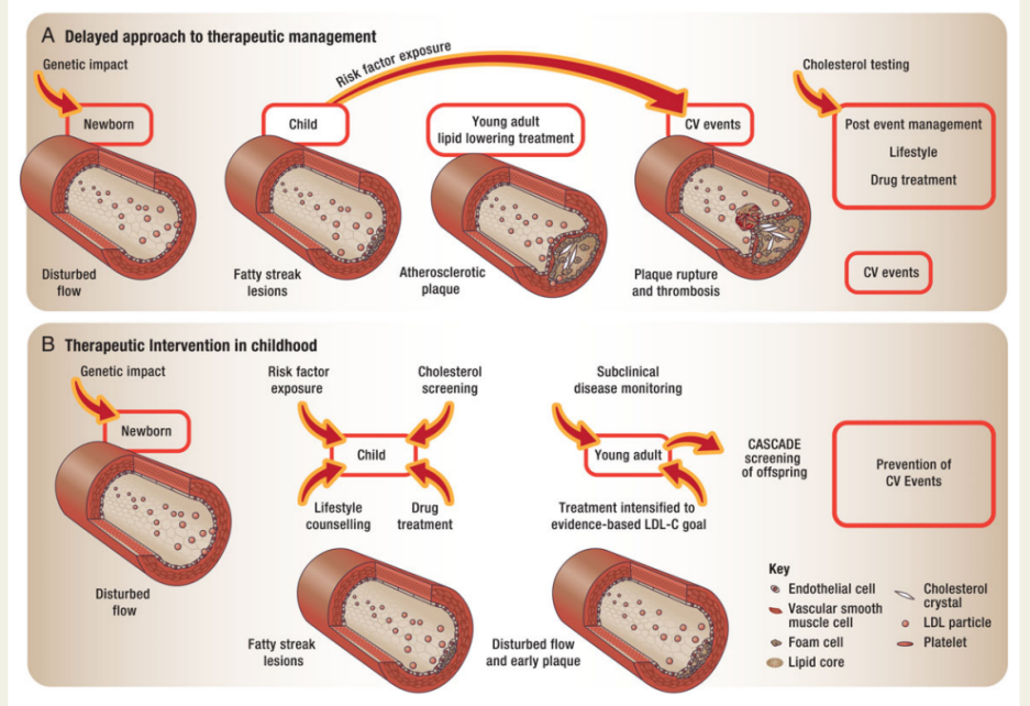 父母偶然发现两个月大的乐乐身上长出了黄色瘤状物,在医院做完检查后进一步发现:乐乐血液中胆固醇、血脂水平超过常人很多。 高血脂不是中老年人才会得的慢性病吗?为什么乐乐这么小就血脂异常呢? 一、2 岁时被确诊 乐乐 2 岁时通过基因筛查查明病因,被确诊为家族性高胆固醇血症(FH)。 FH 主要是由于低密度脂蛋白胆固醇(LDL-C)代谢异常在体内沉积,导致早发动脉粥样硬化性心血管疾病(ASCVD)。FH 属常染色体显性遗传病,其临床特点为 LDL-C 水平极高、多部位黄色瘤、早发冠心病。 患者的血清胆固醇浓度通常较正常人高 6~8 倍。FH 患者表现为肝脏清除循环中胆固醇低密度脂蛋白 (LDLs) 的能力不同程度的降低,从而引起 LDL-C 累积。随着时间的推移,这种累积先是导致「动脉硬化」,随后血管管腔变得越来越窄,流向心脏的血液流速也会随之降低,血栓形成的风险也会增大,血液运输氧气能力减低,此时,如果机体得不到足够的氧气供应,可能会感到胸痛或心前区的少许不适,随着时间、胆固醇水平双重累积下,血管就有可能被完全堵死,导致心脏病的发作。病情严重时,血清 LDL-C 水平可超过 13 mmol/L 。 从胎儿期开始,动脉壁持续暴露于高 LDL-C 水平,加速了胆固醇沉积及血管炎症,成为诱发 ASCVD 的独立风险因素。如果在儿童期能够早诊断及时干预,FH 患儿就能和普通孩子一样拥有健康的生活。 2020 年 8 月,乐乐家人慕名找到上海一家医院的肝移植团队。医生为乐乐完善了一系列检查及评估,确定肝移植手术是唯一能遏制病情进展的办法。乐乐通过肝移植手术后恢复良好。 二、FH 如何诊断? FH 筛查 & 诊断流程 1.LDL-C 水平明显升高:研究显示未治疗的 FH 杂合子患者血清 LDL-C 大多在「5.0mmol/L 以上,纯合子患者血清 LDL-C 水平更高,常 > 13.0mmol/L」。 2. 早发 ASCVD:是 FH 的主要临床表现之一,其中早发冠心病是常见的临床表型。杂合子男性患者多生冠心病,女性发病年龄略晚于男性。纯合子患者大多在青少年期就发生广泛的动脉硬化,并可见急性心肌梗死、猝死等心血管不良事件。 3.黄色瘤:皮肤/腱黄色瘤多出现在肘关节、膝关节伸侧,或臀部及手部等部位」。纯合子患者黄色瘤比杂合子患者出现得更早、更明显。 4.脂性角膜弓:是角膜周边部基质内的类脂质沉积,约 30%的 FH 患者有脂性角膜弓。小于 45 岁的患者出现脂性角膜弓是提示 FH 的重要临床指标。 5.其他:纯合子患者可出现主动脉瓣叶和主动脉根部以及其他动脉钙化,部分患者还可出现主动脉瓣狭窄等。 此外,在确诊 FH 前需排除继发性高胆固醇血症、植物固醇血症等可能引起血 LDL—C 水平升高的疾病。 三、血脂异常的各项指标有哪些临床意义? 血脂异常是指脂蛋白的代谢紊乱,为常见的代谢性疾病。主要包括总胆固醇(TC)、低密度脂蛋白胆固醇(LDL-C)和三酰甘油(TG)升高,和/或高密度脂蛋白胆固醇(HDL-C)降低等。 01. 总胆固醇(TC) 即血液中各种脂蛋白所含胆固醇之总和。主要影响因素有:(1)年龄与性别:常随年龄而上升,但 70 岁后不再上升甚至下降,中青年女性低于男性,女性绝经后 TC 水平较同年龄男性高。(2) 饮食习惯:长期高胆固醇、高饱和脂肪酸摄入可使 TC 升高。 没有任何疾病的健康人如果胆固醇超过 7.2mmol/L,应启动药物治疗。 02. 甘油三酯(TG) TG 受遗传和环境因素的双重影响,与种族、年龄、 性别以及生活习惯(如饮食、运动等)有关。TG 在个体内及个体间变异大,同一个体 TG 水平受饮食和测定时间等因素影响,所以同一个体在多次测定时,TG 值可能有较大差异。 TG>2.26mmol/L 可诊断为高甘油三酯血症。当 TG 超过 5.6mmol/L 重度增高将诱发胰腺炎。 03. 低密度脂蛋白胆固醇(LDL-C) 约占 LDL 比重的 50%,故 LDL-C 浓度基本能反映血液 LDL 总量。影响 TC 的因素均可同样影响 LDL-C 水平。在所有血脂指标中,LDL-C 最重要,研究显示 LDL-C 值越高,动脉粥样硬化、心梗、脑梗风险越高。 04. 高密度脂蛋白胆固醇(HDL-C) HDL 能将外周组织如血管壁内胆固醇转运至肝脏进行分解代谢,即胆固醇逆转运,可减少胆固醇在血管壁的沉积,起到抗动脉粥样硬化作用,所以 HDL-C 也成为「好胆固醇」。 HDL-C 除了受遗传因素影响外,严重营养不良者可伴随血清 TC 明显降低,HDL-C 也低下;肥胖者以及吸烟者 HDL-C 也多偏低;糖尿病、肝炎和肝硬化、高 TG 血症等疾病状态可伴有低 HDL-C。而运动和少量饮酒会升高 HDL-C。 四、血脂测定的注意事项 1. 三天内避免高脂饮食 血脂尤其是甘油三酯,容易受短期食物中脂肪含量的影响而升高。在工作中曾遇到患者在化验前一天吃了烤鸭,第二天抽出来的血都是乳糜状的,影响化验结果。所以在抽血前三天内避免日常饮食以外的高脂饮食。 2. 保持平时的饮食习惯 抽血化验前 2 周要保持平常的生活饮食习惯,才能反映出真实的血脂情况。如果为了检测正常刻意在化验前几天清淡饮食,这种做法就像「作弊」行为。 3. 抽血前一天别喝酒 临床上发现,大量饮酒者 2-3 天之内的血脂浓度,尤其是甘油三酯的浓度常显著升高。所以抽血前 3 天内不能有大量饮酒的情况,24h 内连少量饮酒都不可以。 4. 空腹 10-12 小时 血脂检测的化验单中,参考的正常值范围是依据空腹时间 12 小时左右的结果制订的。因此,只有严格按照要求的空腹时间,才能够和标准的参考范围进行比较。(要严格空腹,早饭喝粥、喝汤也不行) 5. 休息 5 分钟再抽血 