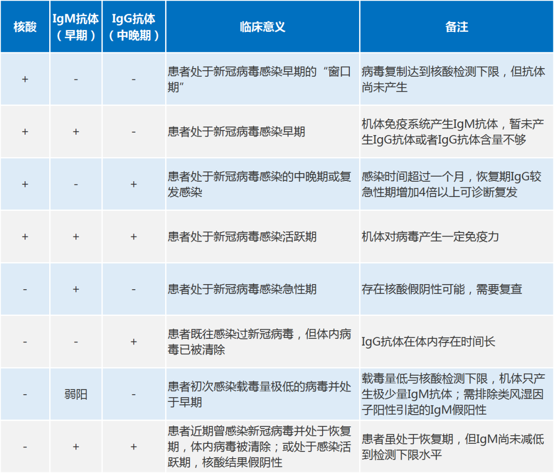 在国务院联防联控机制11月12日下午举行的新闻发布会上,外交部副部长罗照辉表示,核酸检测是通行做法,准确率比较高,即便如此,仍然有3600多例入境中国以后,成为确诊病例。这说明任何一个方法,都不是百分之百的准确。因此,外交部与国家卫健委以及专家经过反复研究,决定实行“双保险”,在核酸检测之外,加上血清抗体的检测,也就是IgM的检测。 罗照辉强调,“双检测”的要求并不是不考虑各个国家的实际情况,不搞“一刀切”。在暂时不能实施血清抗体检测的情况下,用增加一次核酸检测的办法,来代替血清抗体检测,加强“双保险”。 此外,针对乘客在中转过程中奔波于各地,面临很高交叉感染风险的情况,增加在中转地实施“双检测”。“双检测”同样不“一刀切”,在具备“双检测”条件的中转地,就实施检测;在不具备“双检测”条件的中转地,外交部“12308”热线电话和驻外使领馆的领保热线24小时畅通,外交部工作人员全天候应急值守,应对处理。 新冠病毒核酸检测、抗体检测、抗原检测有何区别?一文讲明白! 核酸检测和抗体/抗原检测是确认新冠病毒的重要手段,也是患者确诊的重要流程之一,但你知道他们的检测原理是什么?样本类型有哪些?检验又是一个怎么样的流程以及存在哪些问题 ?今天,小编来给大家科普一下~~ 新型冠状病毒核酸检测 核酸检测具有早期诊断、灵敏度和特异性高等特点,是确诊新冠肺炎的“金标准”,目前使用最广泛的是实时荧光定量RT-PCR技术。一般检测位于病毒ORF1ab和N基因上的两个靶标,同一份标本需满足双靶标阳性或重复检测为单靶标阳性或两种标本同时满足单靶标才能确认SARS-CoV-2病毒核酸阳性。 1、核酸检测试剂盒原理? 以病毒独特的基因序列为检测靶标,通过PCR扩增,使我们选择的这段靶标DNA序列指数级增加,每一个扩增出来的DNA序列,都可与我们预先加入的一段荧光标记探针结合,产生荧光信号,扩增出来的靶基因越多,累积的荧光信号就越强。而没有病毒的样本中,由于没有靶基因扩增,因此就检测不到荧光信号增强。所以,核酸检测其实就是通过检测荧光信号的累积来确定样本中是否有病毒核酸。 2、核酸检测样本类型有哪些? 一般为鼻拭子、咽拭子、鼻咽拭子、痰液、支气管灌洗液、肺泡灌洗液等。 3、五个步骤检测新型冠状病毒 检测程序需要经过五个步骤,取样、留样、保存、核酸提取、上机检测,这需要严谨的科学实验才能完成。 5. 荧光PCR核酸检测,也就是上机器检测,将提取物进行荧光PCR扩曾反应,需要70—80分钟。 4、核酸检测存在哪些问题? 假阴性,由于采样不当、标本保存不当、采用不同类型的标本以及使用不同厂家试剂都可能造成核酸检测结果“假阴性”而出现漏诊; 因此当核酸检测阴性时,将IgM和IgG抗体检测增加进去,可以弥补核酸检测容易造成漏诊的缺点。 新型冠状病毒血清抗体检测 新型冠状病毒肺炎发病7天后,血清特异性抗体逐渐产生,首先出现的是免疫球蛋白IgM抗体,然后出现IgG抗体。因此,IgM抗体增高提示近期急性感染,IgG抗体增高提示既往感染。 血清学检测最大的优势在于方便快捷,检测时间较短,能够有效突破现有检测技术对人员、场所的限制,缩短检测用时,被写进了《新型冠状病毒肺炎诊疗方案(试行第七版)》。如果疑似病例血清特异性IgM和IgG抗体阳性,IgG抗体由阴性转为阳性或恢复期较急性期有4倍及以上升高,则可以诊断其感染了新冠病毒。 1、血清抗体检测试剂盒原理? 采用胶体金免疫技术,在结合垫处喷涂胶体金标记的重组新型冠状病毒抗原和质控抗体金标记物;NC膜上包被两条检测线(G线和M线)和一条质控线(C线)。M线包被有鼠抗人IgM单抗,G线包被有鼠抗抗人IgG单抗,C线包被有质控抗体。样本加到加样孔中,该样本在层析作用下将沿检测卡向前移动,如果样本中含有新冠状病毒IgM抗体,则该抗体与胶体金标记病毒抗原结合,形成夹心复合物,将会呈现阳性结果。如果样本中含有新型冠状病毒IgG抗体,则该抗体会与胶体金标记新型冠状病毒抗原结合,形成夹心复合物,将会呈现阳性结果。该检测卡还包含一条质控线(C线),用于判断层析过程是否顺利。 (图片源于:文献原文) 2、血清抗体检测样本类型有哪些? 一般为血液,包括血清、血浆和全血。 3、三个步骤检测新型冠状病毒 1. 打开检测卡铝箔袋,将检测卡取出并水平放置于桌面上; 3. 等待15分钟,判读结果。 4、血清抗体检测存在哪些问题? 假阳性,个别患者血液中含有类风湿因子、异嗜性抗体、自身抗体,以及药物和肿瘤细胞等,易造成试验的交叉反应,故偶现假阳性的结果; 因此血清抗体检测仅用作对新冠病毒核酸检测阴性疑似病例的补充检测,不能单独作为诊断指标用于筛查。联合使用血清抗体检测与核酸检测,有助于提高疾病的检出率,尽可能地找出确诊患者,更有利于疫情的控制。 核酸与IgG、IgM抗体联合检测的结果解读 新型冠状病毒抗原检测 新型冠状病毒抗原检测可直接检测出人体样本中是否含有新型冠状病毒,诊断快速、准确、对设备和人员要求低,采用双抗夹心法,使用两种抗原特异性抗体去识别和结合一个靶点抗原的不同表位,则可以大大降低交叉反应的几率,从而有效提高其特异性。 1、抗原检测试剂盒原理? 新型冠状病毒的N蛋白、E蛋白和S蛋白等抗原,可作为免疫原,在病毒感染人体后,刺激浆细胞产生特异