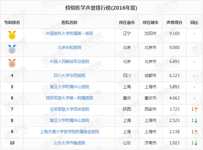 相比2018年度,榜单变化不大。前10榜单中仅仅南方医科大学南方医院被山东大学第二医院取代。其他9所医院检验专科只是排名有小幅调整。