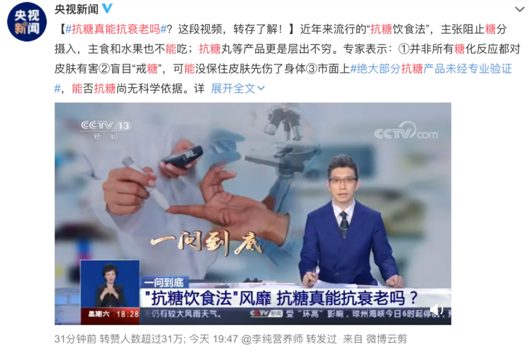 阮光锋 丁香医生作者 营养与食品安全硕士 食品与营养信息交流中心科技部主任 近期央视做了一期节目专门探讨「抗糖到底能不能抗衰老」。 图片来源:网络截图 最近几年,抗糖丸、抗糖口服液、抗糖面膜等等抗糖产品层出不穷,这些产品都宣称自己能防止皮肤衰老。 很多人在这些宣传下对「糖」是更加深恶痛绝,纷纷开始「抗糖饮食法」,甚至为了抗 「糖」 完全戒糖了。 戒糖真的能抗糖吗?抗糖产品真的能抗衰老吗?今天我来跟大家聊聊抗糖那些事儿。 人体糖化反应是缓慢进行的 糖化,全称叫做「非酶糖化反应」,指还原糖(如葡萄糖)在没有酶催化情况下,与蛋白质、脂质或核酸在经过缓慢的反应后,最终生成一系列的晚期糖化终末产物(AGEs)的过程。 糖化反应的产物 AGEs 会对我们的肌肤和身体都产生影响,带来的结果就是让皮肤更容易长皱纹、失去了光泽,暗黄长斑等等衰老表现,所以,一些商家顺势就推出了「抗糖化」的概念,并大作营销。 其实,「糖化」这个概念的时候,最早是在食品烹调加工中发现的。 典型的是比如在很多食物中常见的「美拉德反应」,它是还原糖(如葡萄糖)和氨基化合物如蛋白质等在常温或加热时发生的反应,会生成棕色至棕黑色物质,同时产生独特的风味。很多爱吃的红烧肉、烧烤、面包,都是它的功劳…… 实际上,食物也会在烹调过程中产生同样的 AGEs 物质,而且数量比人体内产生的要多得多。 动物食品当中,以及脂肪含量高的食品当中,都往往含有相当高水平的 AGEs,特别是那些炭烤、烧烤、炖烧、油炸、干煸等烹调方法,所产生的 AGEs 水平特别高。 不过,食品加工中的「美拉德反应」可是在高温条件下反应所得,我们人体内不可能达到这么高温度,所以,人体内的糖化反应是缓慢进行的,衰老的表现也是缓慢发生的。 「抗糖」和「戒糖」不是一回事 在看到「抗糖」的概念时,很多人理所当然地就会把「抗糖」理解成就是「戒糖」、「限糖」、「减糖」、「控糖」,就认为是要少吃糖。 其实,这种理解完全大错特错。 「戒糖」、「限糖」、「减糖」、「控糖」的糖,主要是指饮食中的单糖和二糖,并不是指碳水化合物,通常包括我经常给大家说的「添加糖」或者「游离糖」。 「添加糖」是指人为添加到食品中的单糖或者双糖,比如蔗糖、红糖、冰糖、果糖、麦芽糖、果葡糖浆等等。而「游离糖」的范围除了添加糖,还包括食品中「天然」存在、跟添加糖一样会被快速吸收的糖,比如果汁、蜂蜜等。 而市场上火爆的「抗糖化」「抗糖产品」中抗的糖,其实是人体内的「糖基化」这个反应所产生的糖基化反应产物 AGEs。 实际上,戒糖对体内糖化反应并没有直接的影响。 分析清楚戒糖和抗糖的区别后,我想大家都清楚了。其实,我们说的戒糖,和商家说的抗糖,根本不是一个概念。 实际上,就算我们戒糖,人体内依然会进行糖化反应。因为我们吃的碳水化合物,比如淀粉,进入人体后一样会转化成葡萄糖,体内的糖化反应依然会不停地进行着。这是生命的必然。 只要你还活着,糖化反应就不会结束,衰老也会继续缓慢地进行着。这是自然规律,从我们出生的那一刻起,人体就已经开始慢慢衰老了。 「抗糖」产品,不一定抗衰老 目前市面上的抗糖化产品多种多样,什么抗糖化液、丸、片等(口服),抗糖化面膜(外用)等,都说自己可以抗衰老。 但是这些东西真的有用吗? 「糖化反应」确实可能是造成皮肤衰老的原因之一。但是,糖化并不是皮肤衰老的唯一原因。事实上,糖化并不是老化的主要因素,只占其中很小一部分。 导致皮肤老化的原因非常多而且复杂,比如熬夜、晒伤、年龄增长,都会伴随着皮肤老化。 市场上的抗糖产品真的可以帮助我们抵御糖化反应吗? 实际上,现在并没有某个抗糖化药物或保健品是真正通过国家药品监督管理局(NMPA)批准的,因此我们完全可以对现有相关产品的有效性打个问号。 目前市售抗糖丸产品所含的主要成分都是一些抗氧化的物质、植物提取物,或者就是胶原蛋白。这些植物提取物、抗氧化物质,其实多吃点蔬菜水果也能方便获得,没必要花那么多钱。 延缓皮肤衰老 更需要做好防晒 使皮肤衰老的因素很多,按照类别通常可以分为两大类: ➊ 外源性老化:包括紫外线、吸烟、空气污染、外伤等,其中占比最重的是「紫外线」,它是皮肤的头号杀手。糖化反应只占非常小的一部分。 ➋ 自然老化:包括遗传因素(衰老基因生效)。这方面每个人的差异很大,即使同龄人有时候看起来也差距很大。 延缓皮肤衰老,更需要做的其实是这些: ➊ 防晒 导致皮肤老化最主要的因素是「紫外线」。为了防止老化,平时一定要注意防晒,避免紫外线损伤,可采取打遮阳伞、穿戴防晒衣帽和太阳镜,以及涂抹防晒霜等措施达到防晒的目的。 ➋ 避免空气污染,远离烟草烟雾 烟尘、废气、工业排放物和汽车尾气等也会加速皮肤的衰老,大家要尽量远离这样的环境,在家里可以使用空气净化器。另外,戒烟并远离二手烟。 ➌ 不要熬夜
