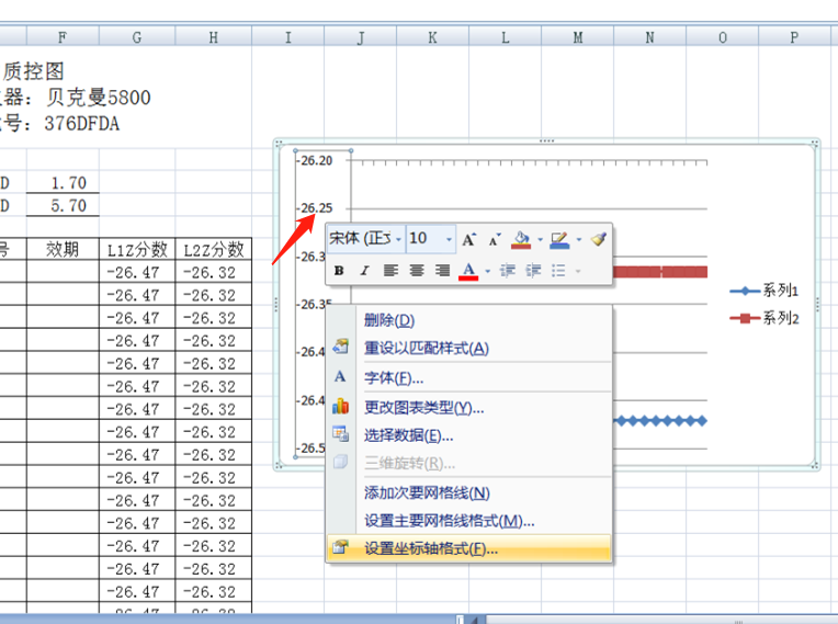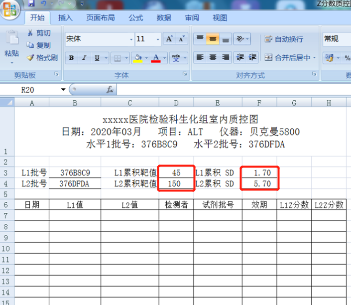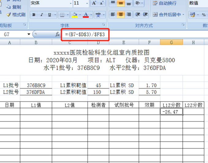 赵晴 | 昆明市东川区人民医院检验科 番云华 | 德宏州人民医院检验科 检验科没有LIS系统及质控软件如何做室内质控图?本人在2020年5月19日发表的文章《用Excel表格绘制检验科室内质控图(附视频)》中,讲述如何用Excel表格处理质控中的平均数`X、标准差SD、变异系数CV值及绘制Levey-Jennings质控图,但Levey-Jennings图仅能绘制单个水平质控图。 Z分数质控图能同时绘制两个水平或者多个水平浓度的质控图。可以将不同浓度水平质控物进行标准化后绘成一份质控图[1]。 Z分数质控图与Westgard多规则质控方法联合应用可以判断误差的性质[2]。当不具备条件的基层实验室采用Microsoft Excel绘制Z分数质控图是最好的选择[3]。一般用 13S和R4S可检出随机误差,用22S、41S、10 规则可检出系统误差。Z分数回答这样一个问题:“一个检测值距离靶值多少个标准差?”这段距离含有几个标准差,Z分数就是几。 Z分数的计算公式为: X为测定值, 为靶值,SD为标准差。举例: X为159, 为靶值150,标准差9.0Z分数=(159-150)/9=1 此时,检测数值159离靶值150有1SD距离。 具体操作如下: 先分别输入两个水平浓度质控的累积靶值、累积SD值。 计算水平1Z分数:光标点击G7处,输入=(B7-D3)/F3→Enter. 但因为累积靶值和SD值需要绝对引用,所以要带上$符号。 最终水平1Z分数输入格式为=(B7-$D$3)/$F$3→Enter. 最终水平2Z分数输入格式为=(C7-$D$4)/$F$4→Enter. $符号输入法:英文输入状态下键盘上shift+4可输入。 相对引用及绝对引用知识点: 相对引用:在Excel快速填充表格时,相对引用公式里的字母数字会变化,数值随之改变。 绝对引用:公式套用,字母数字不变,数值不变。 如还一头雾水,可将$符号加上或去除后,待光标变成“十字”拖动各试一次效果就能明白。 用鼠标拖动G7、H7,将光标移至单元角,待光标变成“十字”图标,向下拖动,用Excel快速填充表格至H37。 先用光标同时选中G7、H7至G37、H37数据(选中数据很重要),再点击工具栏“插入”→“图表”→“折线图”(要选带数据标记的折线图)→完成。 先点击折线图后再右击,选择菜单“选择数据”。 设置水平轴标签,水平轴标签即为检测日期。“编辑”→鼠标拖动A7至A37数据→确定。 点击折线图竖轴上的任一数字后右击,选择“设置坐标轴格式”。 输入最小值-3,最大值3,主要刻度单位1,次要刻度单位1,横坐标交叉轴值-3。 在空白处输入医院名称、日期、项目名称、质控物批号、仪器型号等。 当要制作新的质控图时,只需复制已建好的质控工作簿,重新输入数据计算机便会自动绘图。 ~END~ 室内质控是质量控制的基础,用于评价检验科测定结果的精密度及准确度,而绘制质量控制图是质量控制工作的主要内容。Z分数能同时绘制两个及以上不同浓度水平的质控图,在没有LIS系统及质控软件的基层医院使用Z分数质控图经济、简便、易于推广应用。 【参考文献】 [1]季晓东,邱毅,刘毅菊,等.Z分数质控图联合变异指数分数得分在本院室间质量评价中的应用[J].中国卫生检验杂志,2020,30(10):1263-1265,1268. [2]吴宗勇,刘秋颖,李佳,等.Z分数质控图在室间质量评价报告总结中的应用[J].检验医学与临床,2018,15(9):1239-1240,1244.DOI:10.3969/j.issn.1672-9455.2018.09.007. [3]庄小青,罗士来,杨露,等.Z分数质控图常用质控规则在ExceI中逻辑设计与判断[J].实验与检验医学,2015,(6):734-737.DOI:10.3969/j.issn.1674-1129.2015.06.014. |