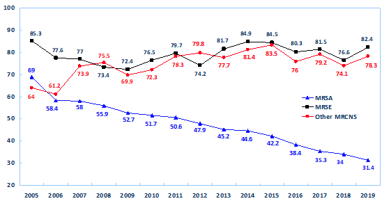 甲氧西林耐药凝固酶阴性葡萄球菌(MRCNS)全国平均检出率为75.4%,较2018年下降了0.3个百分点;MRCNS检出率地区间有一定差别,其中陕西省最高,为80%,宁夏回族自治区最低,为58.7%。MRCNS的总体耐药率仍然处于较高水平。