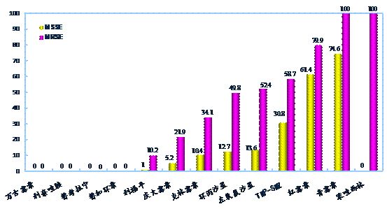 脑脊液标本前5位分离菌:表皮葡萄球菌、鲍曼不动杆菌、人葡萄球菌、肺炎克雷伯菌和头状葡萄球菌MSSE(849株)与MRSE(3967株)对抗菌药的耐药率(%)