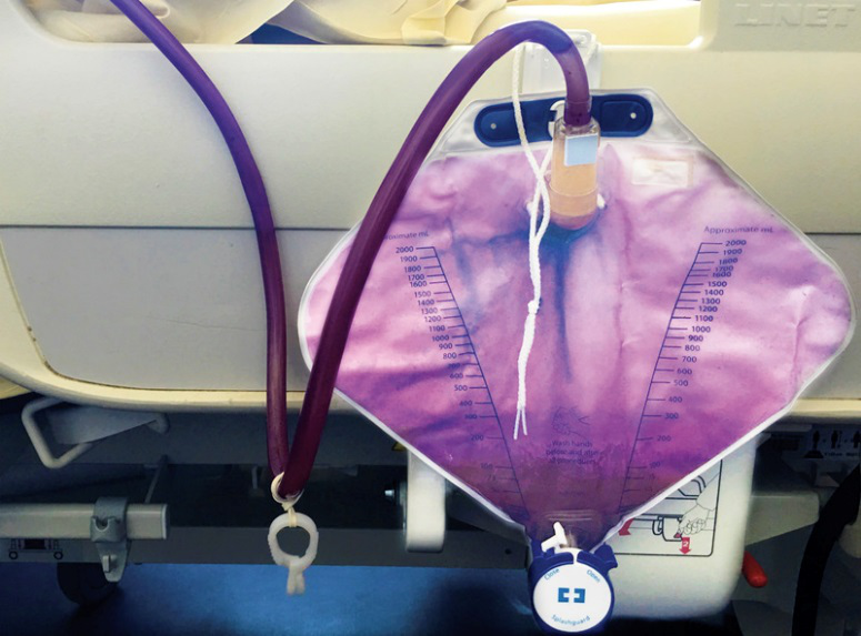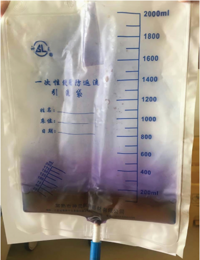 一名 96 岁女性患者,因痴呆、失能、反复肺部感染于 2016 年 8 月起在北京协和医院住院治疗。患者因难以自行进食,自 2016 年 9 月起留置胃管,长期使用肠内营养混悬液鼻饲;因尿失禁,骶尾部皮肤破溃难于愈合,自 2016 年 10 月起留置尿管。 患者既往对青霉素、链霉素多种抗生素过敏,且有长期便秘病史。近期无服用利福平或甜菜根等可能影响尿色的用药或进食史。2017 年 4 月 10 日,无诱因尿袋中尿色发紫。紫色尿液(图源:中国医学科学院学报)