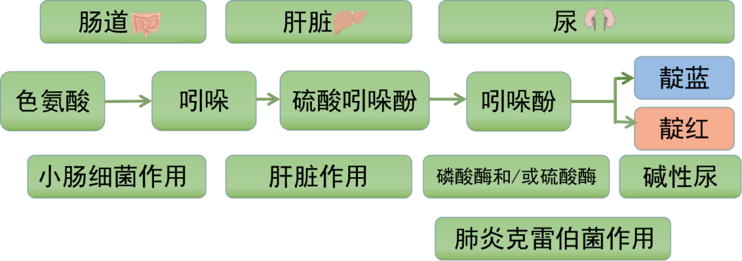 尿常规检测显示:尿比重 1. 015,白细胞 15 个细胞 /μl,尿蛋白 0. 3 g /L,pH 8. 5,亚硝酸盐试验为阳性。尿培养回报为超广谱 β- 内酰胺酶阴性的肺炎克雷伯菌,菌量 > 105CFU/ml,对包括环丙沙星、头孢他啶、哌拉西林在内的多种抗生素敏感。磷酸酶试验提示该菌具有磷酸酶活性。当日患者无发热,未诉尿路刺激症状,更换尿管、尿袋并密切观察病情。3 d 后尿袋内尿色再次呈紫色。4 月 15 日患者出现发热,无畏寒、寒战及尿路刺激症状。血常规检测:白细胞 17. 9 × 109 /L,中性粒细胞 14. 3 × 109 /L,较前明显升高。考虑泌尿系感染,结合患者过敏史及尿培养病原学药敏结果选用环丙沙星治疗,并更换尿袋。经治疗后,患者体温下降,尿袋内尿色恢复了正常。尿袋变紫色这种有趣的临床现象,其实是一种罕见的病症,称为「紫色尿袋综合征」(purple urine bag syndrome,PUBS)。PUBS 于 1978 年在《柳叶刀》首次报道,指留置导尿患者尿管或尿袋中尿液呈紫色。研究发现 PUBS 是由于尿中细菌分解色氨酸形成有色物质导致的。目前报道的此类案例非常少,《新英格兰医学杂志》(NEJM)曾报道一名 70 岁女性因急性中风入院并留置尿管,在导尿第 10 天,患者的尿液诡异的呈现紫色。尿常规提示白细胞增多,亚硝酸盐阴性,酸碱度 8.0。随后,在尿培养中检出了肺炎克雷伯菌。尿色发紫主要是由于其中存在靛蓝 (蓝色) 和靛红 ( 红色) 两种有色物质。(1) 患者通过食物或肠内营养制剂摄入丰富的色氨酸。(2) 由于长期卧床,患者胃肠蠕动慢,食物中的色氨酸在小肠内细菌的作用下,充分代谢,产生大量吲哚。(3) 吲哚在肝脏代谢为硫酸吲哚酚,随后进入尿中。尿液中具有磷酸酶和 / 或硫酸酶活性的肺炎克雷伯菌,催化碱性尿液中的硫酸吲哚酚转化为靛蓝和靛红,前者为蓝色,后者为红色,二者混合后使尿袋呈现了紫色。 PUBS 的发生机制 | Curr Urol