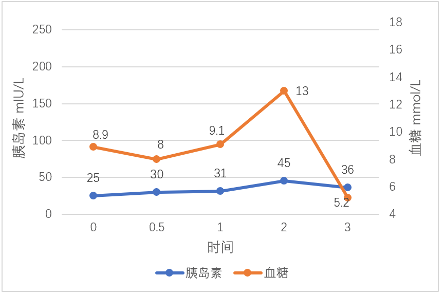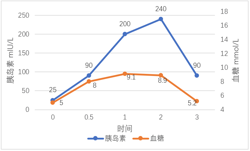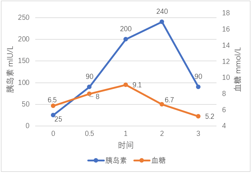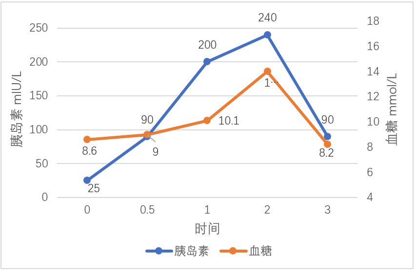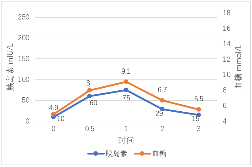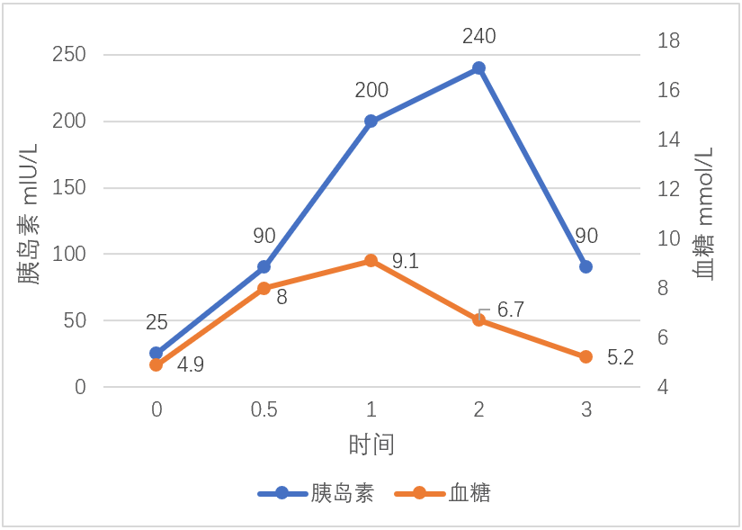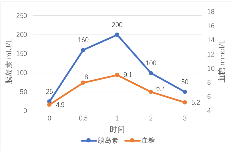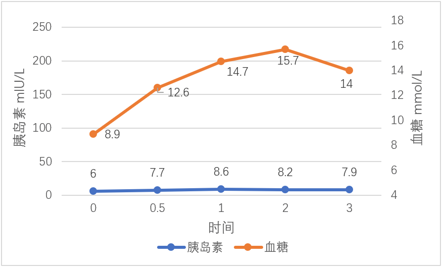 OGTT 和胰岛素释放试验是糖尿病诊疗过程中常见的检测手段,临床中为了节约时间、减少工作量,在不影响检测结果和诊断的前提下,经常合二为一,即 OGTT - 胰岛素释放试验。 正常人空腹基础血浆胰岛素水平约为 5-20mIU/L,其口服葡萄糖后胰岛素水平 30-60 分钟上升至高峰,可为基础值的 5-10 倍,3-4 小时恢复到基础水平。 首先试验在早上 7-9 点进行,实验前患者休息 15-30min,采集空腹样本。将 75 g 无水葡萄糖溶解于 250 ~ 300 mL 水中, 5 min 内喝完,并从喝第一口开始计时:在 30、60、120、180min 分别采集样本进行胰岛素检测,观察 5 次胰岛素检测结果并进行分析。 以下是根据几种典型的胰岛素释放试验结果绘制的折线图(见图 1),结合 OGTT 试验了解每个折线图所表现的临床意义。 图 1 是一个正常胰岛素释放试验的折线图,正常人基础血浆胰岛素为 5~20 mU/L,口服葡萄糖 30~60 min 上升至峰值可为基础值的 5~10 倍,多数为 50~100 mU/L, 然后逐渐下降,3 小时后胰岛素降至基础水平。 从图 2 可以看出胰岛素空腹水平正常,0.5-1 小时升高不到 5-10 倍,2-3 小时后逐渐恢复正常水平,但糖耐量在正常范围内。说明该患者不需要太多胰岛素即可使血糖正常,即对胰岛素敏感。 从图 3 可以看出空腹胰岛素水平高于正常水平,存在胰岛素抵抗(IR),0.5-1 小时后升高 5 倍以上,胰岛素代偿性分泌增多,即高胰岛素血症。糖耐量在正常范围内。 从图 4 看出空腹胰岛素水平高于正常水平,有胰岛素抵抗(IR)。胰岛素分泌高峰在餐后 2 小时,糖耐量在正常范围内。此类患者有 IR 且伴胰岛素分泌高峰延迟,为 2 型糖尿病早期表现。胰岛素释放试验结合 OGTT 可早期发现 T2DM,该类型易出现餐前低血糖。 图 5 看出存在胰岛素抵抗(IR),且伴胰岛素分泌高峰延迟,为 T2DM(2 型糖尿病)典型表现。空腹血糖大于 6.1mmol/L 小于 7.0mmol/L 被称为空腹血糖受损。此病例空腹血糖 6.5mmol/L 为空腹血糖受损。 图 6 看出胰岛素抵抗(IR)且伴胰岛素分泌高峰延迟,为 T2DM(2 型糖尿病)典型表现。2 小时血糖大于等于 7.8mmol/L 小于 11.1mmol/L 称为糖耐量降低,此病例 2 小时血糖 8.9mmol/L 为糖耐量降低。 图 7 看出空腹胰岛素水平升高,口服糖水后上升至高峰时间及数值正常,代表仍胰岛素敏感,但 2 小时血糖大于 11.1mmol/L,为 2 型糖尿病。 图 8 看出空腹胰岛素水平升高,但血糖仍高于正常,有胰岛素抵抗(IR),为 2 型糖尿病,胰岛素分泌高峰延后,胰岛细胞受损较严重,应加用胰岛素。 图 9 看出空腹血糖大于 7.0mmol/L,胰岛素水平在服用糖水后没有明显升高,没有出现明显的峰值,血糖升高明显且降低缓慢,为典型的 1 型糖尿病。 1、本试验最大的优势就是可以协助判断患者是否存在胰岛素抵抗的情况。