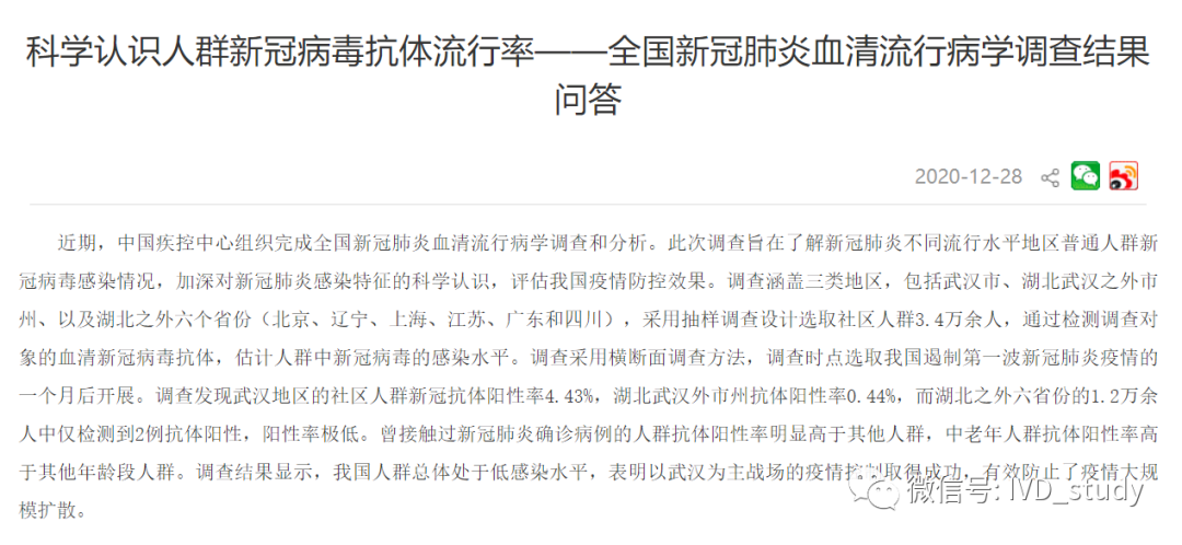 近期,中国疾控中心组织完成全国新冠肺炎血清流行病学调查和分析。此次调查旨在了解新冠肺炎不同流行水平地区普通人群新冠病毒感染情况,加深对新冠肺炎感染特征的科学认识,评估我国疫情防控效果。 太长不看版: