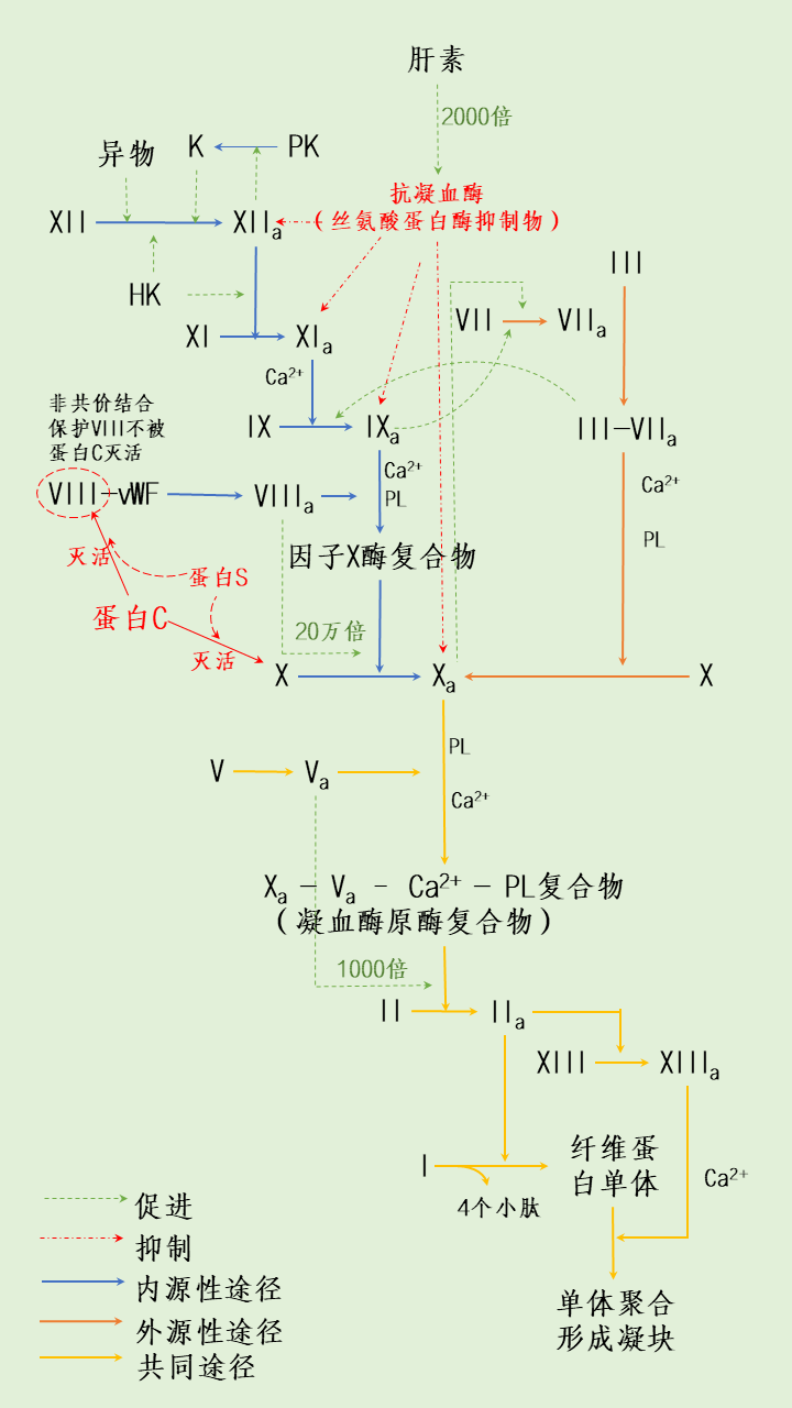 各位检验人周末好,往期有小伙伴留言想要学习凝血途径,本周「每周一图」栏目为大家安排: 血液凝固是由凝血因子按一定顺序相继激活而生成的凝血酶,最终使纤维蛋白原变为纤维蛋白的过程。凝血过程可分为凝血酶原酶复合物的形成、凝血酶的激活和纤维蛋白的生成三个基本步骤。 凝血因子是血浆与组织中直接参与血液凝固的物质的统称,目前已编号的凝血因子有 12 种,即凝血因子 I~XIII(VI 已不再被视为独立的凝血因子),除 IV 是 Ca2+ 外,其余均为蛋白质,其中 II、VII、IX、X 的生成需要维生素 K 的参与。 根据启动方式和参与的凝血因子不同,可将生成凝血酶原酶复合物的途径分为内源性凝血途径和外源性凝血途径两种。内源性凝血途径是指参与凝血的因子全部来自血液,通常因血液与带负电荷的异物表面(如玻璃、白陶土、胶原等)接触而启动。由来自血液之外的组织因子暴露而启动的凝血过程称为外源性凝血途径,当机体处于病理状态下时,细菌内毒素、补体 C5a、免疫复合物、肿瘤坏死因子等均可刺激血管内皮细胞和单核细胞表达组织因子,从而启动凝血过程,引起弥漫性血管内凝血。
