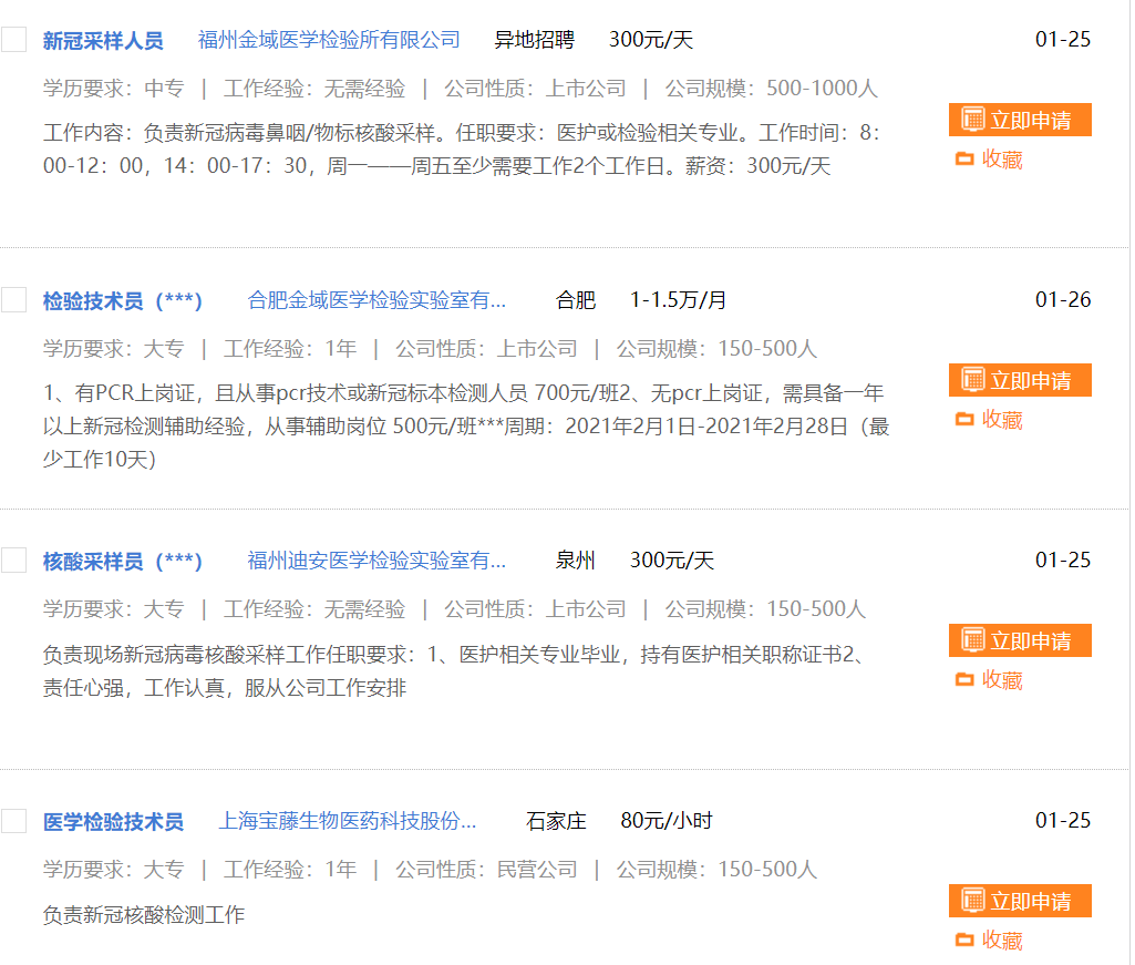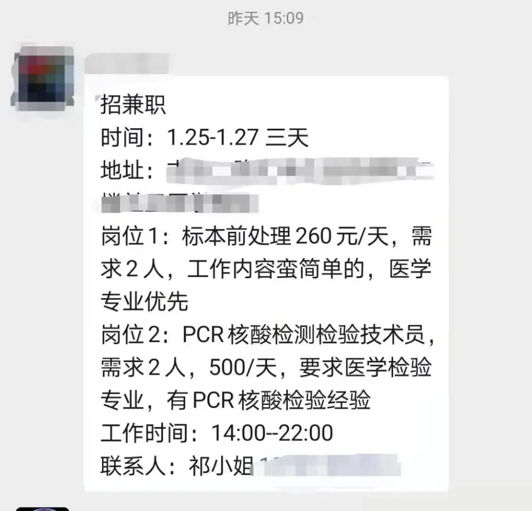 1月20日,国务院发布春节返乡新规:返乡人员需持7日以内的核酸阴性检测证明;全国各地检测机构要在收到样本后的12小时内反馈检测结果。 据国家卫健委20日发布的《冬春季农村地区新冠肺炎疫情防控工作方案》要求,返乡后实行 14 天居家健康监测,每 7 天开展一次核酸检测。 返乡政策一出,引发全网关注。可以预期的是,春节返乡政策将催生出巨大核酸检测需求。 政策效应传导下,大量医院已经出现火爆的核酸检测场面。 上海闵行某检测点 深圳某检测点 广东省第二人民医院核酸检测点 斗门遵义五院核酸检测点 深圳市西乡医院 “排队3小时,取样1分钟”可以说是目前各地医院核酸检测点的真实写照。 天量的核酸检测 检测能力跟得上吗? 据交通运输部消息,预计 2021 年全国春运期间发送旅客在 17 亿人次左右,日均差不多 4000 万人次。保守估测春节期间核酸检测人次为1.7亿人次(占比10%)。 当前,我国的核酸检测试剂日产能为665.5万人份以上。针对可能会出现检测量的激增,各地及核酸检测相关机构能满足需求吗? 根据中国国务院联防联控机制的数据,截至1月13日,全国 8437 个医疗卫生机构可以开展核酸检测,单管检测能力达到每天 1255 万人份,相当于 2020 年 3 月底( 126 万人份)的 10 倍。 持核酸检测阴性证明返乡从1月28日春运开始后实施,至3月8日春运结束后截止,共40天。就预期而言,现有的核酸检测能力对于应对春运核酸检测需求来说基本可以满足。 当然对于劳动力输出大省来说,其检测能力能否在短期内经受住考验目前可能还存疑。 巨大的需求背后 是一个个加班熬夜的检验人 自疫情爆发以来,检验人的身影一直活跃在抗疫的第一线。 春节返乡政策一出,可以想见的是,一大波标本正在赶往各地医学实验室!不论是医院检验科、疾控中心检验科、第三方检验实验室还是区域检验中心,未来1到2个月的工作压力巨大! 因为核酸检测的时效性,预计这波核酸检测高峰将在二月初达到顶峰。为保证实验室24小时都处于工作状态,很多地方可能又将「三班倒」! 检验人,你真的准备好了吗? 检测需求 催生短期兼职市场 为了缓解检测压力,不少检测机构发出类似“临时工”的兼职招聘。 某招聘网站截图 某检验微信群截图 有按天计费的,也有按时给钱的。有招采样人员也有招检测人员的。对于检测人员而言,基本都需要相关工作经验和PCR上岗证。 如果有意的,可以去找找类似的兼职信息。 请提高检验人的待遇 春节返乡政策一经推出,A股核酸检测概念股连掀涨停潮,企业老板赚翻了; 返乡核酸检测全自费,各地核酸检测点大排长龙,医院可以借此“回血”; 冒着感染风险辛苦工作,加班熬夜的人是不是应该获得一点回报? 为众人抱薪者,不可使其冻毙于风雪。 |