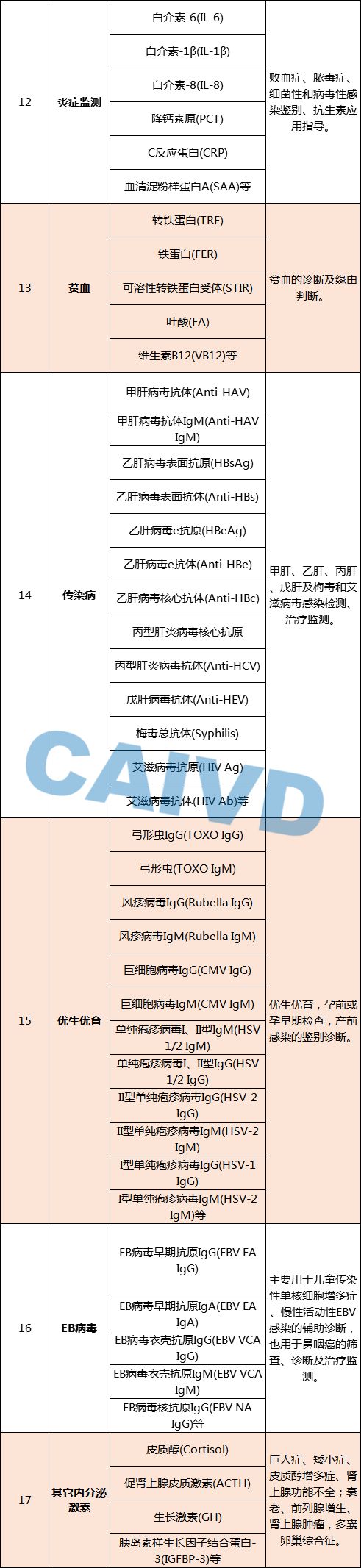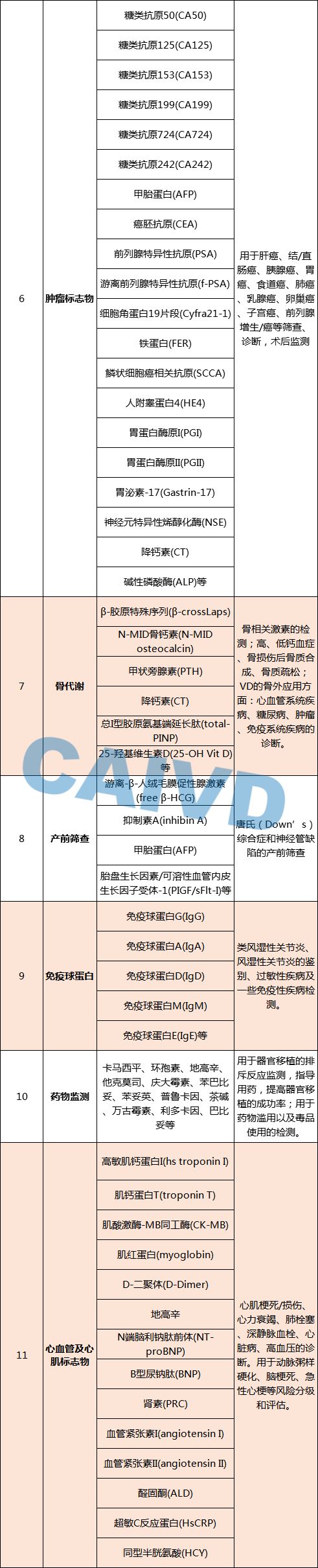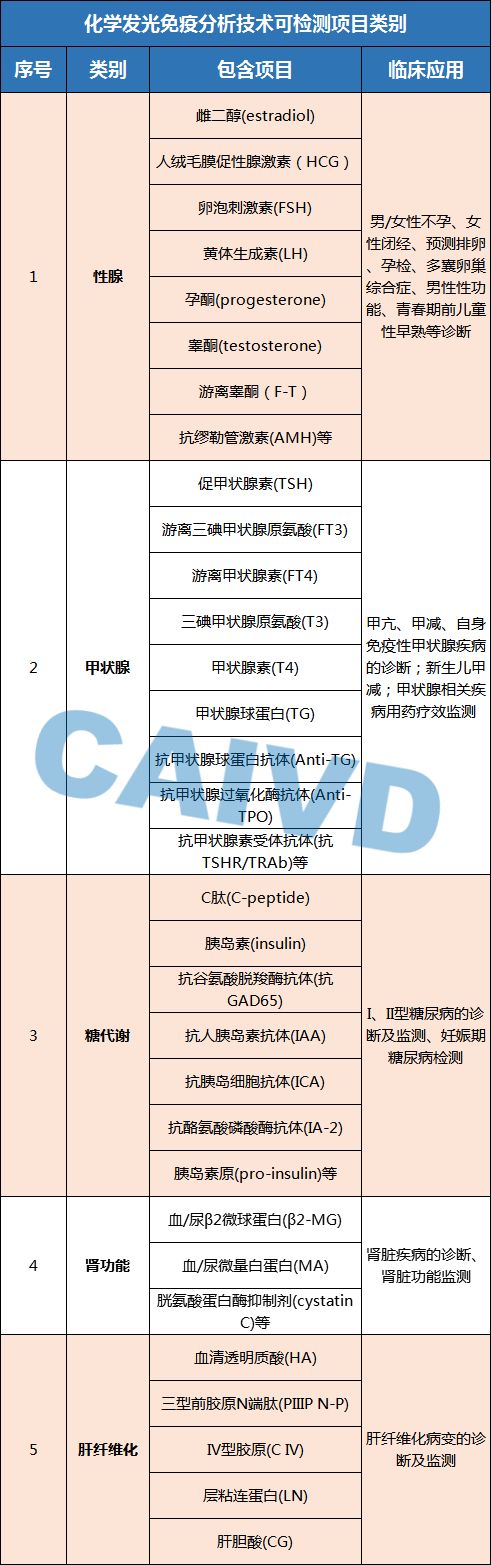 化学发光免疫分析技术主要具有灵敏度高、特异性强、试剂稳定性好且有效期长、检测线性范围宽、操作简单、方法稳定快速、检测项目多(如下图)、自动化程度高等优点,该技术已成为目前免疫分析技术的主流方法,广泛应用于临床检验的各个领域。