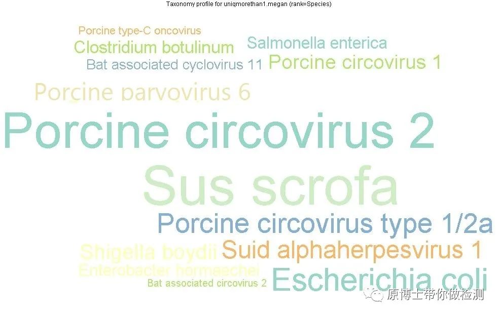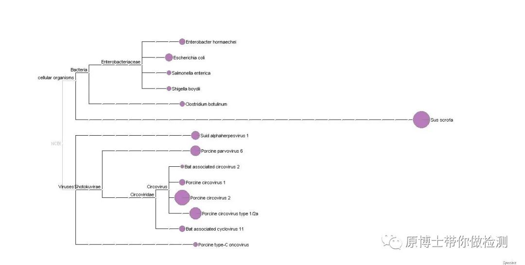 “很久很久以前”本公众号迎来了第一篇投稿“下雨天巧克力和音乐最配,那纳米孔测序和动物疫病诊断配么?”今天终于等到了刘小满同学的第二篇文章,非常感谢小满对文章的精(shan)益(shan)求(lai)精(chi)。本年度本公众号将开设一二三代丶冫测序专题,分享测序的原理和相关的案例。希望能给大家带来有用的信息。测序的基本原理可以回看 检测人眼中的测序技术发展史。 图1 测序结果 1.下机数据量统计 使用NanoPlot对测序结果进行质控分析(见图2),共获得10.5万条序列(即reads数),合计46Mb碱基,平均序列长439.6bp,最长一条序列达到30Kb。 图2 NanoPlot质控分析图 2.物种分析 对下机数据进行物种分析,结果显示(见图3、表1),PRV和PCV2都有大量序列被检出,这与荧光结果一致,尤其是PCV2,检出的序列数达到7643条,占样品中所有病毒序列的82.7%(即微生物丰度)。PRV检出143条,微生物丰度为1.55%。PPV6(Porcine parvovirus 6)检出347条,微生物丰度为3.76% 图3 物种分类图 表1 MinION下机数据物种分析
