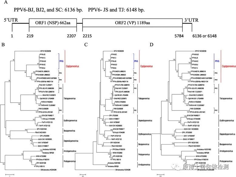 #对于宏基因组数据分析来说,除了考虑检出的reads数以外,其他重要的指标还包括覆盖度(coverage)以及测序深度(depth),这两个指标是相对于参考病毒基因组全长而言的。 #覆盖度(coverage)就是指检测到某种微生物的序列覆盖到该微生物全基因组的比值,覆盖度越高表示检测到某微生物的序列覆盖到该微生物全基因组的比值越高,也就越有可能就是该种微生物。 #测序深度(depth)是指样本中某个指定的核苷酸被检测到的次数,数值越大表示样本中检测到该碱基的次数越多,可靠性也就越高。 2.1 PCV2 从表1的结果来看,PCV2的覆盖度达到参考序列的100%,平均测序深度更是达到了1800次以上(见图4),说明该样品中PCV2的检测结果非常可靠,而且一个测序反应即拿到了病毒的全基因组。 图4 PCV2的覆盖度及测序深度 2.2 PRV PRV本次测序获得的序列与参考基因组相比覆盖度不足50%,平均深度不足1%(见图5),但考虑到PRV的基因组较大,达到150Kb,50%的覆盖度也相当于测到了近70Kb的片段,因此认为该物种的检出结果也比较可靠。 图5 PRV的覆盖度及测序深度 2.3 意外发现的PPV6 意外的是,在对下机数据进行物种分析时,还发现347条猪细小病毒PPV6序列,微生物丰度甚至超过了PRV,达到3.76%,与参考序列相比覆盖度竟然达到100%,平均测序深度超过80(见表1和图6)。 图6 PPV6的覆盖度及测序深度 3.PPV6的背景调查 PPV6是2014年由Jianqiang Ni等(Ni and Qiao et al., 2014)首次在我国发现。 图7 PPV6 进化树(参考文献2) 随后2015年,美国学者通过病毒宏基因组测序,在美国和墨西哥的多个地域发现该病毒(Schirtzinger and Suddith et al., 2015),并且与中国天津健康猪中获得基因序列同源性最高。2017年波兰报道检出该病毒(Cui and Fan et al., 2017)。至此,世界范围亚洲、欧洲、美洲均有该病毒的流行。尽管该病毒感染可能产生的相关临床症状仍有待进一步确定,但其流行范围及流行率还是比较高的。中国报道的回顾性流行病学调查中发现该病毒在育肥猪和母猪中的流行率分别为15.6%和3.8%,而在流产胎儿和仔猪中的流行率达到50%和75%,并且与其健康状况无关。同时,出现繁殖障碍的猪场流行率为16.7%,而无繁殖障碍的猪场流行率在13.6~21.7%。美国报道的流行率为13.2%,波兰的流行率为14.9%。 本案例结果表明,在病毒感染的临床样品中,造成感染的病毒微生物丰度通常很高,通过纳米孔测序对该类样品进行检测和诊断时,不受目标病毒种类的限制,可真正做到“一网打尽”。 参考文献: