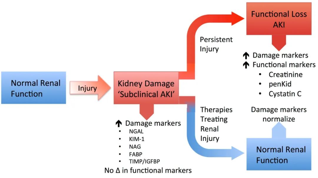 急性肾损伤(AKI)是住院患者常见且严重的并发症,伴有严重的发病率和死亡率。在临床实践中,血清肌酐水平和尿量是肾功能障碍最常用的指标,但它们有一定的局限性。由于肌酐的反应延迟和缺乏特异性症状,在诊断时可能已是AKI晚期,经常无法获得内源性急性肾损伤的早期特异性治疗。另一方面,肌酐通常反映慢性肾病而非急性肾损伤。它们具有有限的敏感性和特异性,肌酐水平变化缓慢,因此限制了它们在AKI的早期检测中的应用。