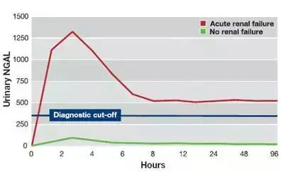 研究表明: 健康人群尿液中NGAL平均浓度为5.3 ng/mL (范围0.7-9.6 ng/mL); 血浆中NGAL平均浓度63 ng/mL (范围3-106 ng/mL)。 肾损伤后NGAL水平急剧上升。 任意选择的重症监护室患者尿液中NGAL浓度可达到110 ng/mL-40,000 ng/mL;血浆中NGAL平均浓度25 ng/mL-3491ng/mL。 尿NGAL水平高于350 ng/mL或血浆NGAL水平高于400 ng/mL,急性肾功能衰竭阳性预测值约为90%。