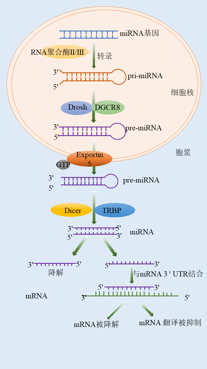 各位检验人周末好,往期有小伙伴留言想要学习 miRNA 的产生相关内容,本周「每周一图」栏目为大家安排: 微小核糖核酸(miRNA)是近年来发现的一类高度保守的内源性小非编码单链 RNA,由 19-24 个核苷酸组成,主要通过与靶基因 mRNA 的 3' 非翻译区(3'UTR)以碱基互补配对的方式与靶序列结合,调节靶基因翻译机制。 miRNA 的加工成熟主要包括以下过程: 首先,miRNA 基因在细胞核内被转录成初级 miRNA(即 pri-miRNA),其长度从几百到几千个碱基不等,包含一个到数个发夹茎环结构,且带有5' 帽子和 3'polyA 尾巴组成。 然后,在核酸酶 Drosha 和其辅助因子 Pasha 的作用下,pri-miRNA 进一步被加工形成前体 miRNA(pre-miRNA),由 70 个核苷酸组成,然后通过 GTP 依赖的 Exprotin-5 复合物,pre-miRNA 被转运进入胞质。 最后 pre-miRNA 进一步经过 Dicer 酶剪切,形成双链 miRNA:miRNA,随后一条 miRNA 链被降解,另一条成熟的 miRNA 链与靶mRNA 的 3'UTR 结合,使靶 mRNA 被降解或者翻译被抑制,以达到调控蛋白表达的目的。 随着测序技术的发展和人类多个基因组计划的完成,大量 miRNA 被鉴定出来,越来越多的研究发现,这些曾经因不能编码蛋白质而被称为基因组中的「暗物质」或「垃圾RNA」在细胞的增殖、分化、凋亡等生理过程中发挥着重要作用,甚至有望成为新兴的生物标志物,用于癌症的筛查、诊断、疗效监控等方面。 |